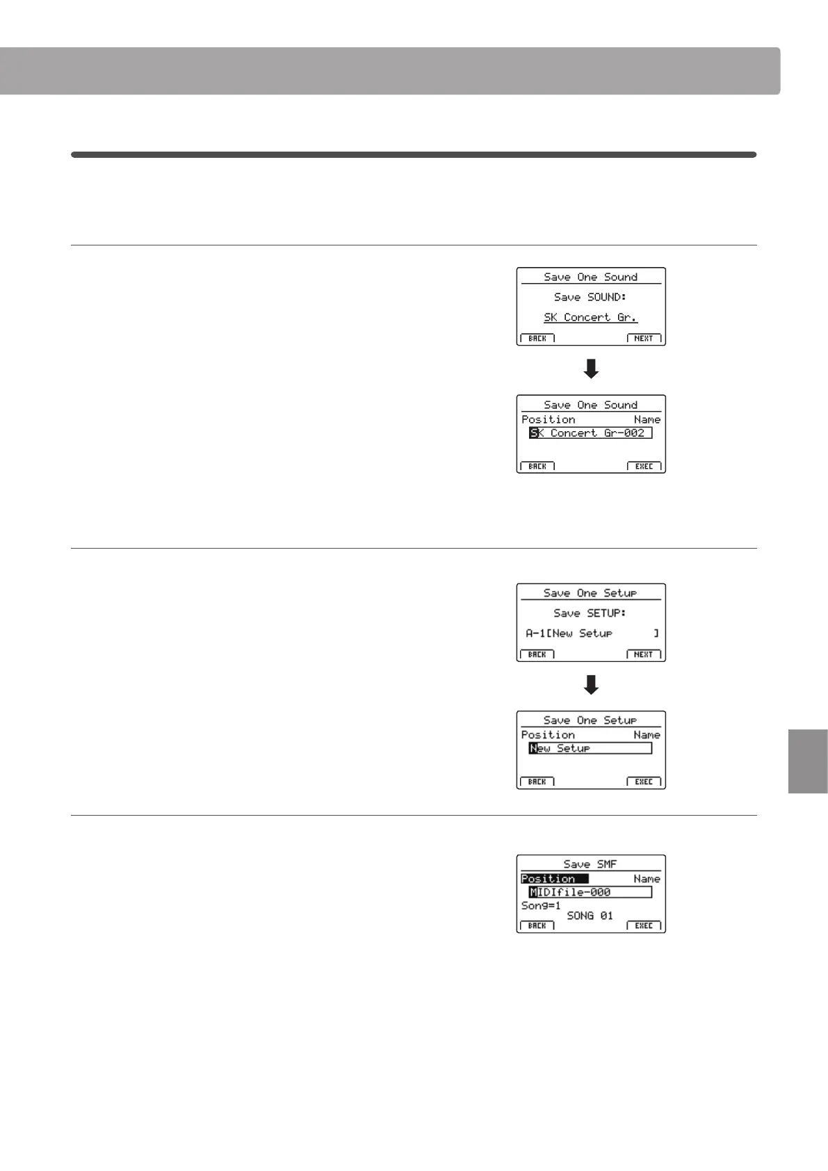 Enter a name for the saved SOUND le using control knobs A