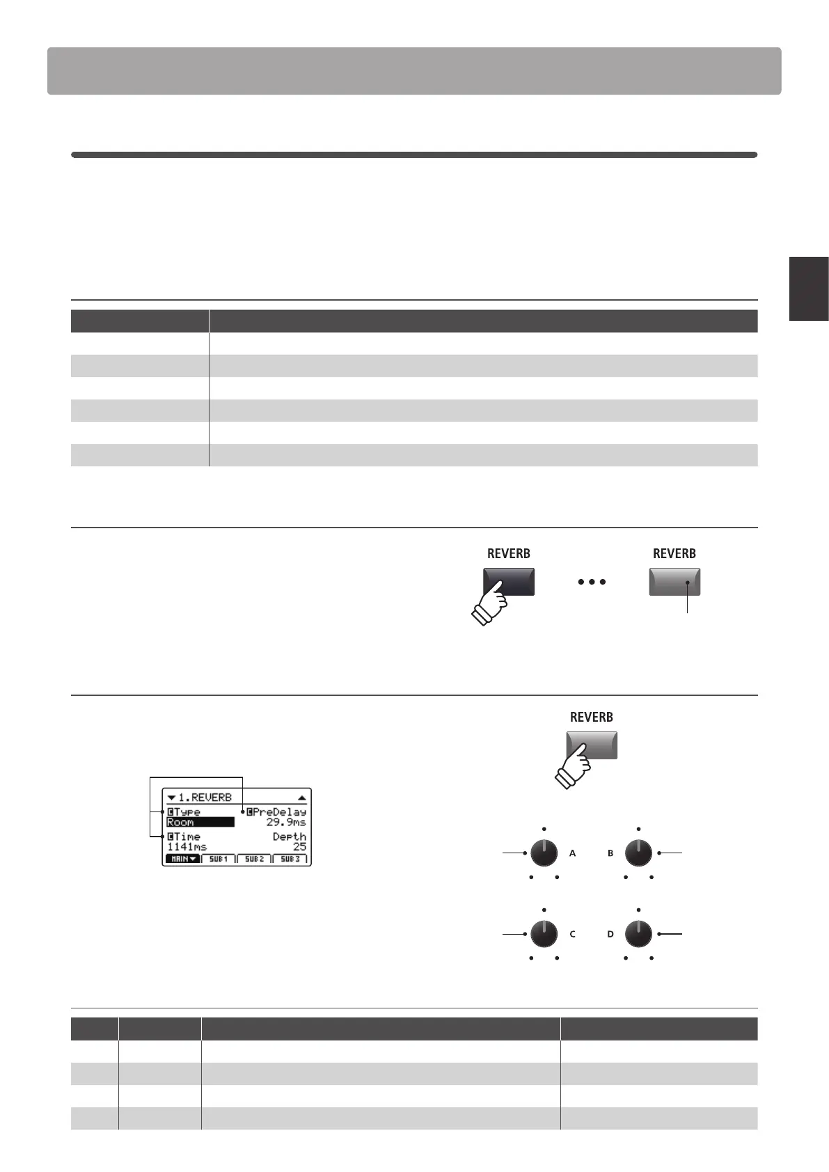 Turn the four control knobs (A, B, C, D) to change the reverb type
