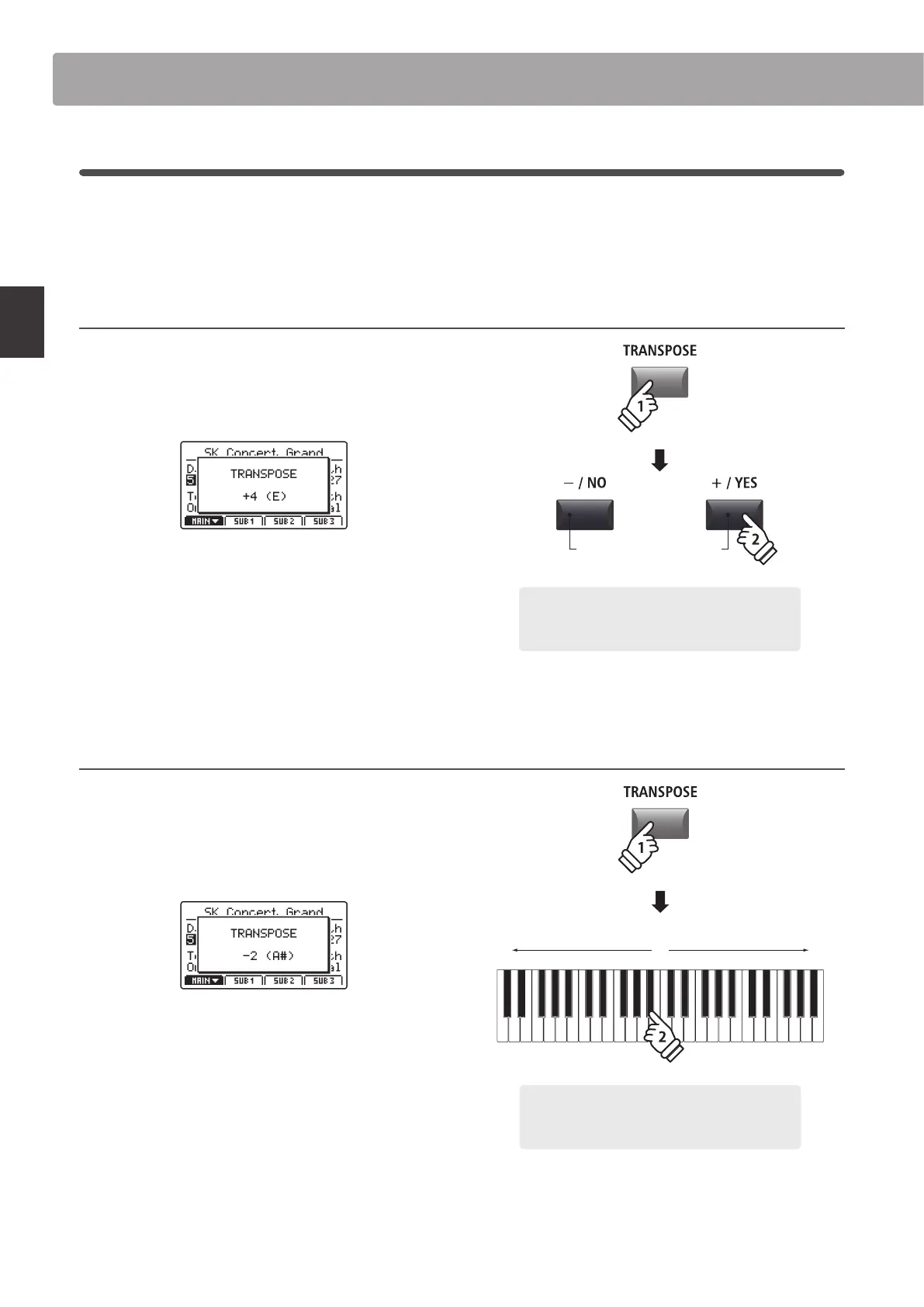 or –/NO buttons to increase or decrease the transpose value in