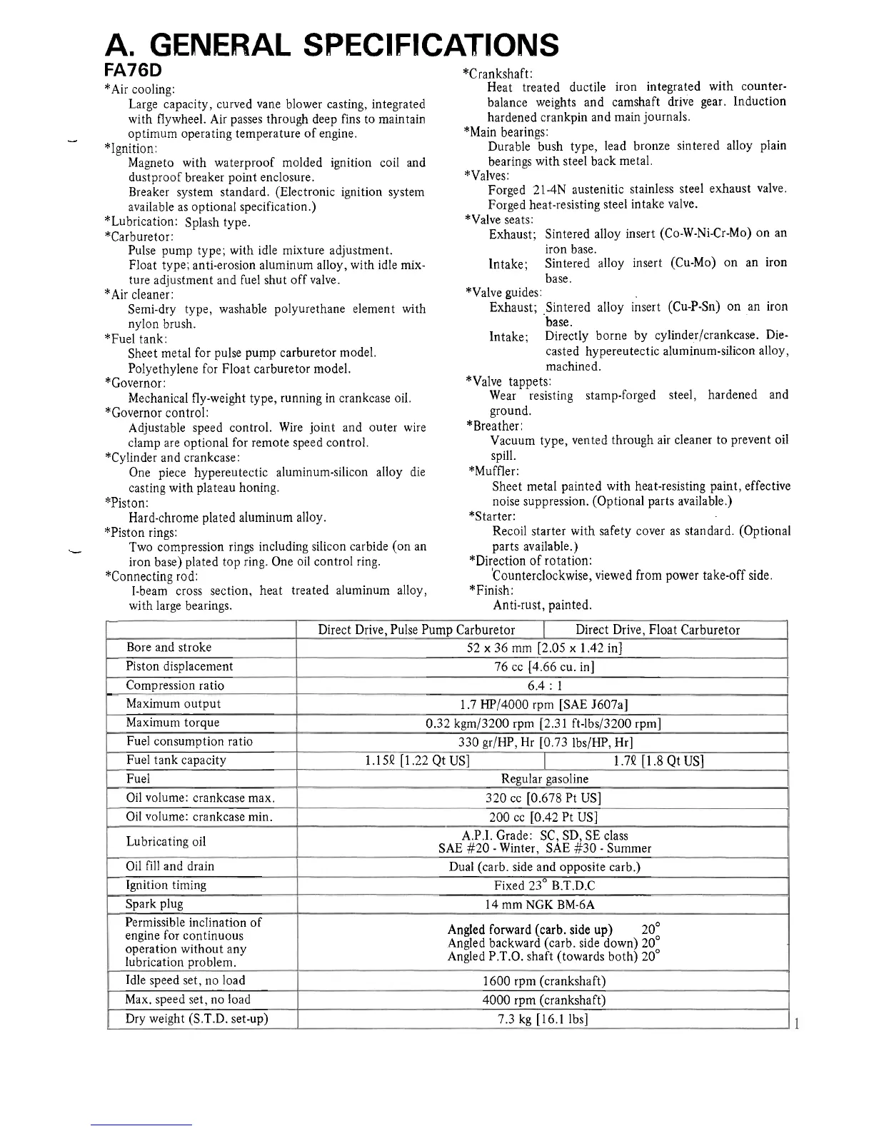 A. GENERAL SPECIFICATIONS