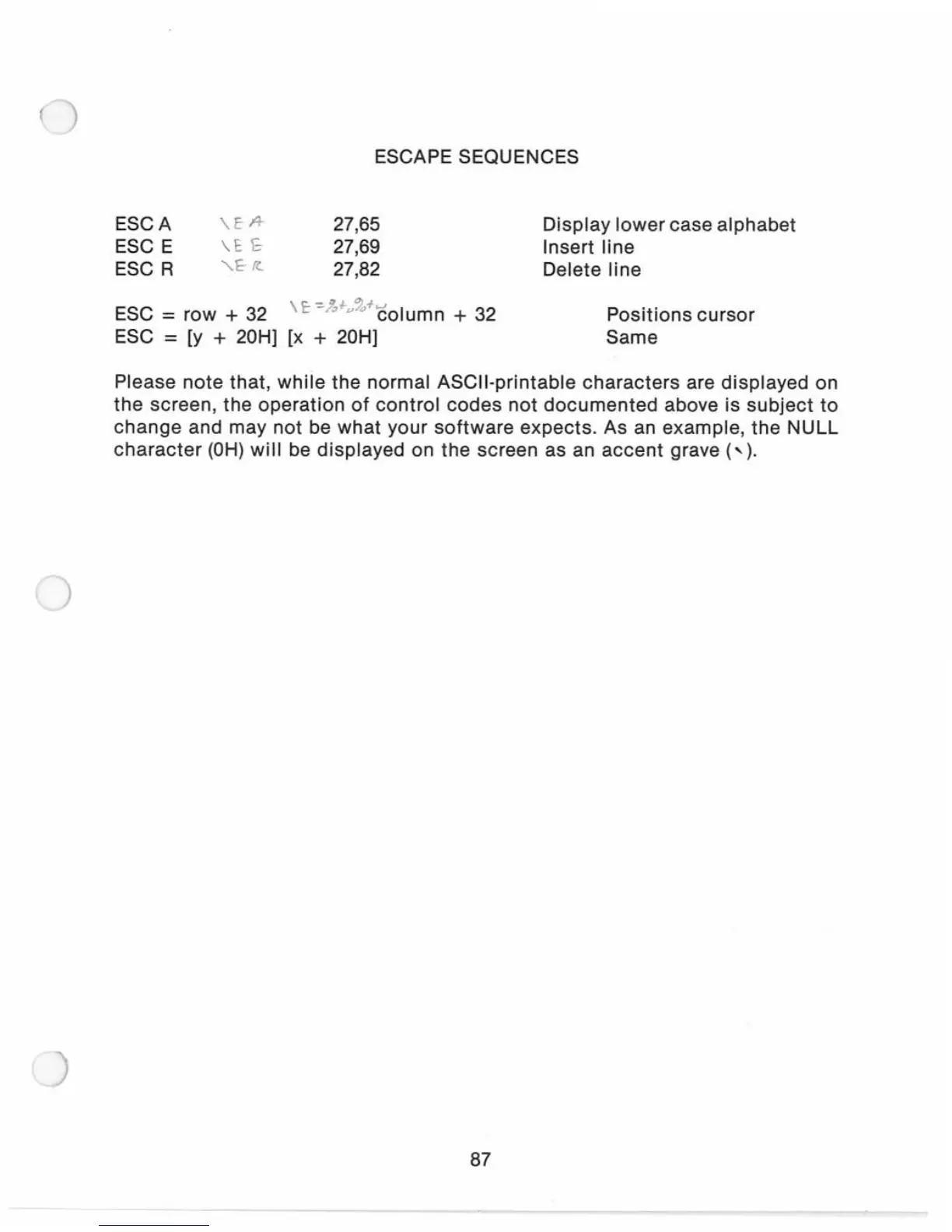 ESC = [y + 20H]
