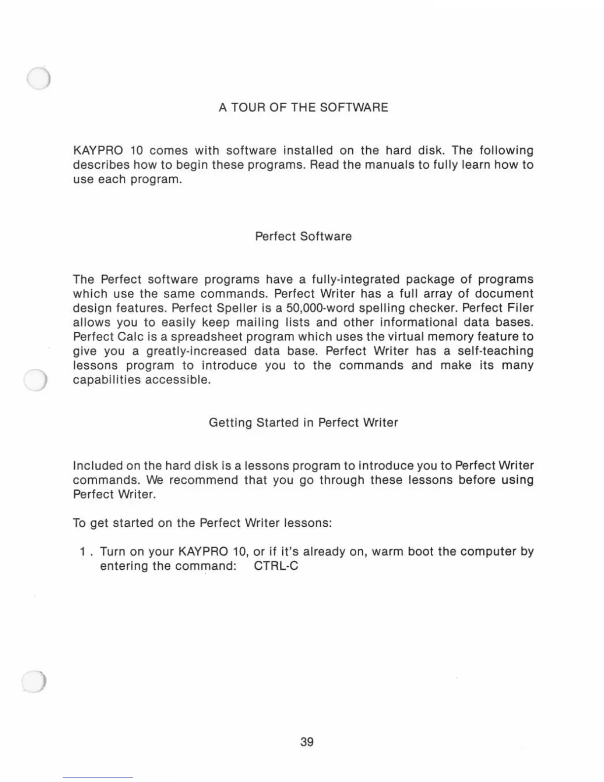 Kaypro 10 - A TOUR OF THE SOFTWARE; Perfect Software Overview; Getting Started with Perfect Writer