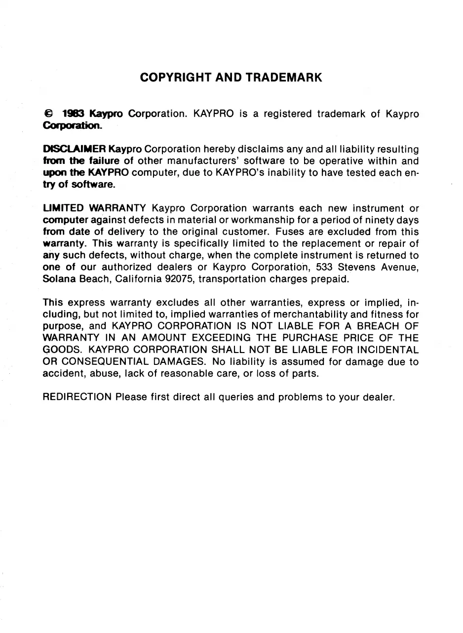 1983 Kaypro Corporation. KAYPRO is a registered trademark of Kaypro