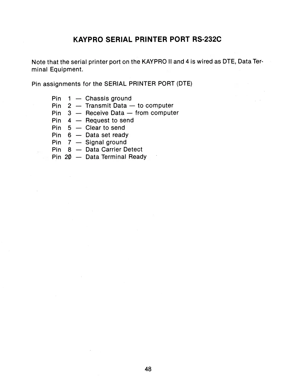 Note that the serial printer port on the KAYPRO II and 4 is wired as DTE, Data Ter-