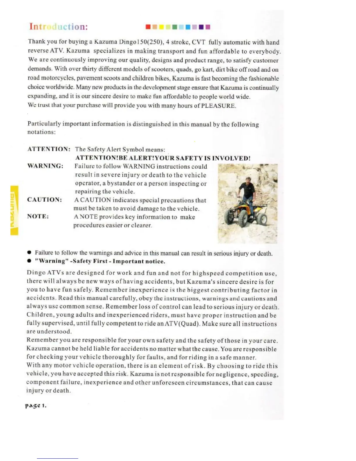 Kazuma Dingo150 - Safe Riding Practices and Rider Responsibility; Introduction and Safety Notations