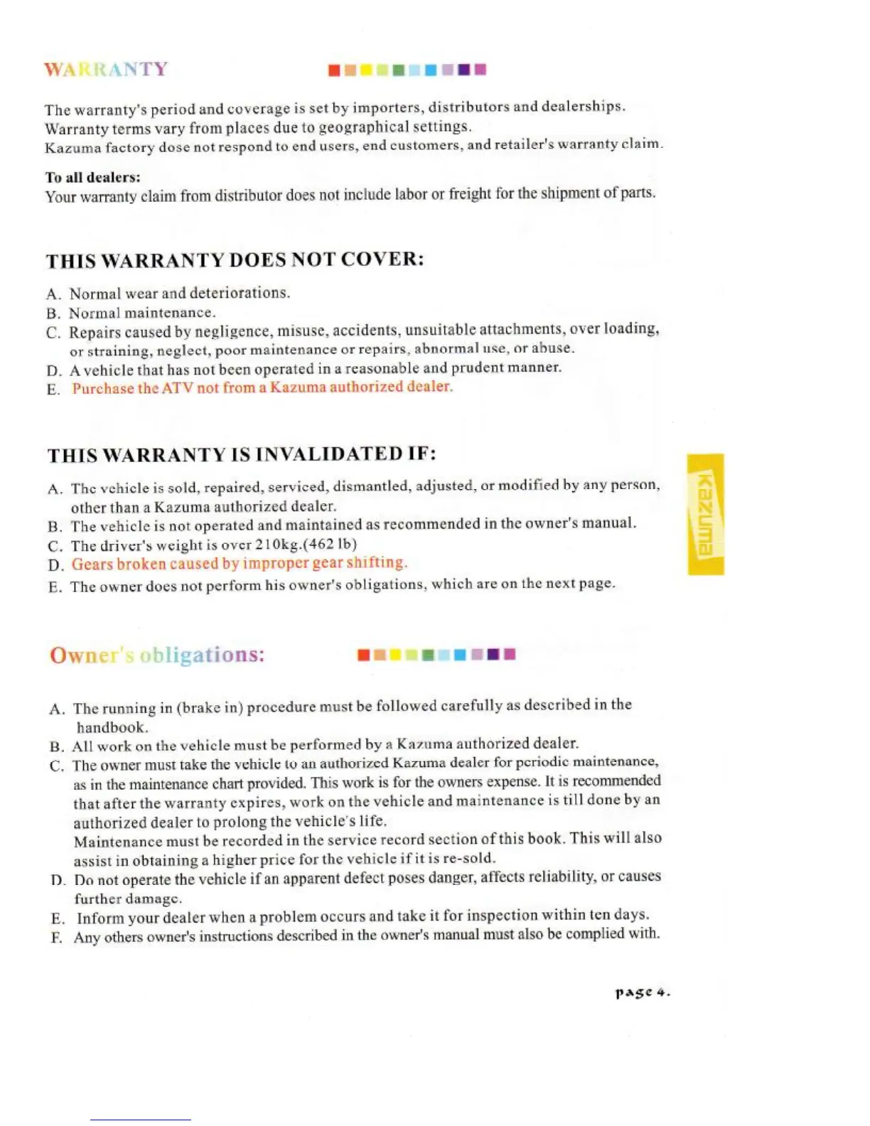 Kazuma Dingo150 - Warranty Information; Warranty Coverage and Exclusions; Owners Obligations and Responsibilities