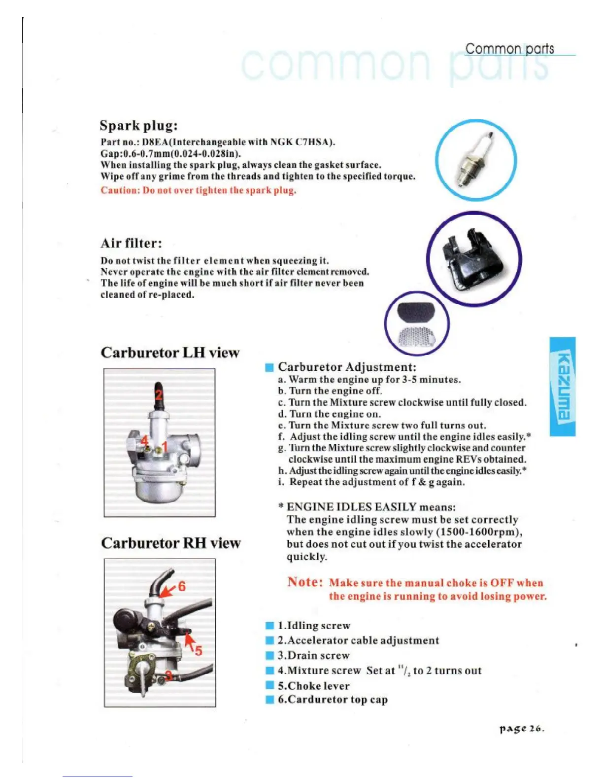Kazuma Falcon - Carburetor, Spark Plug, and Air Filter
