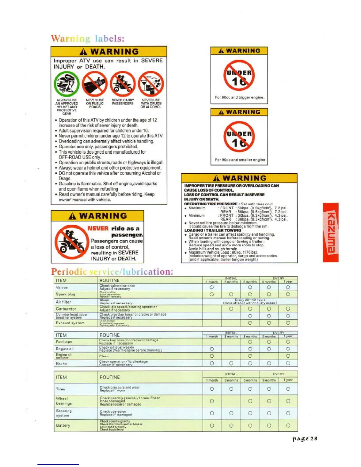 Kazuma Lacoste - Warning Labels; Periodic Service;Lubrication
