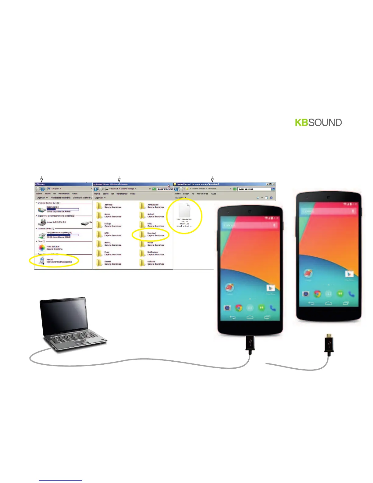 2. in the PC: upload the the App file (KBSOUND-ANDROID-V0.XX .apk) to the folder DOWNLOADS in the smartphone