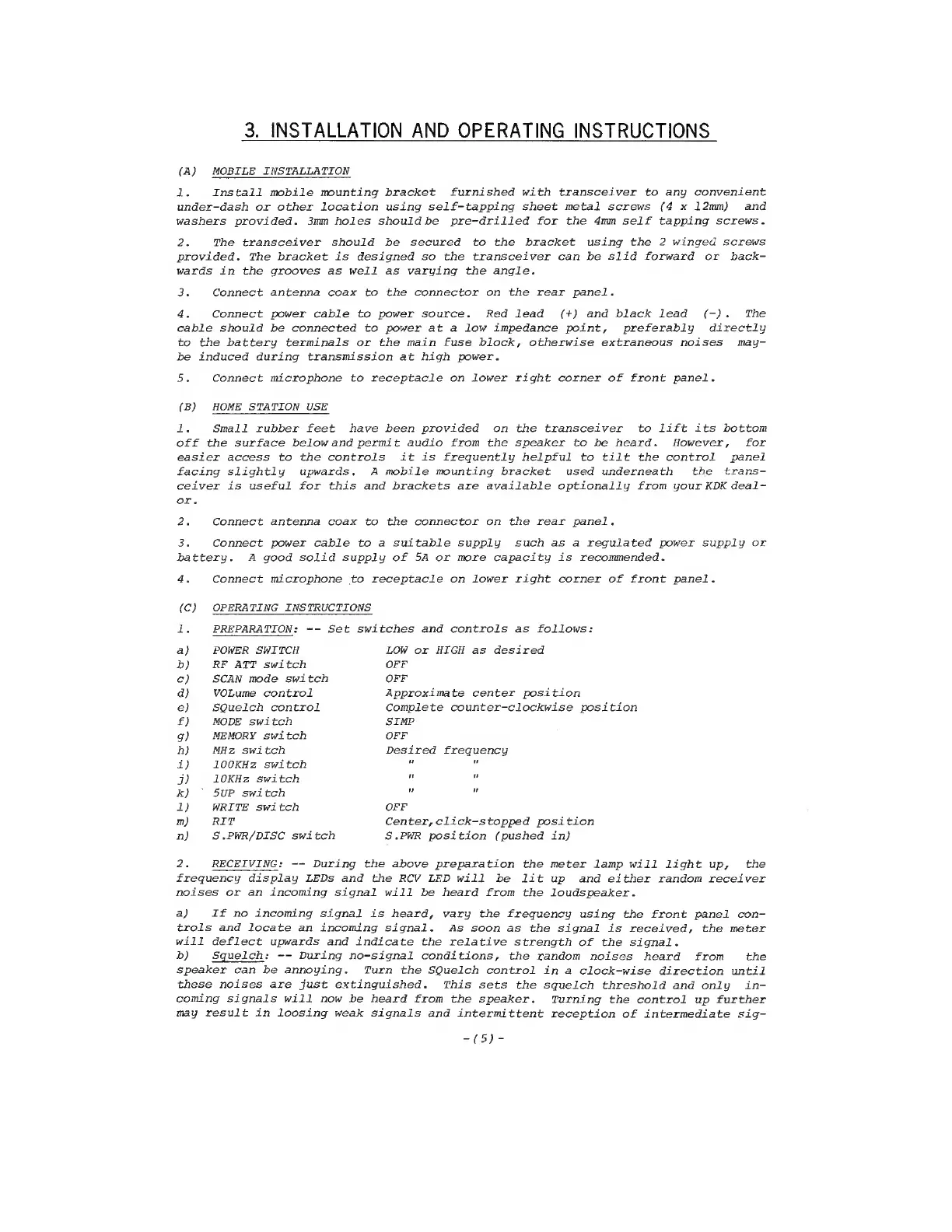 KDK FM-2016A - Installation and Operating; Mobile Installation