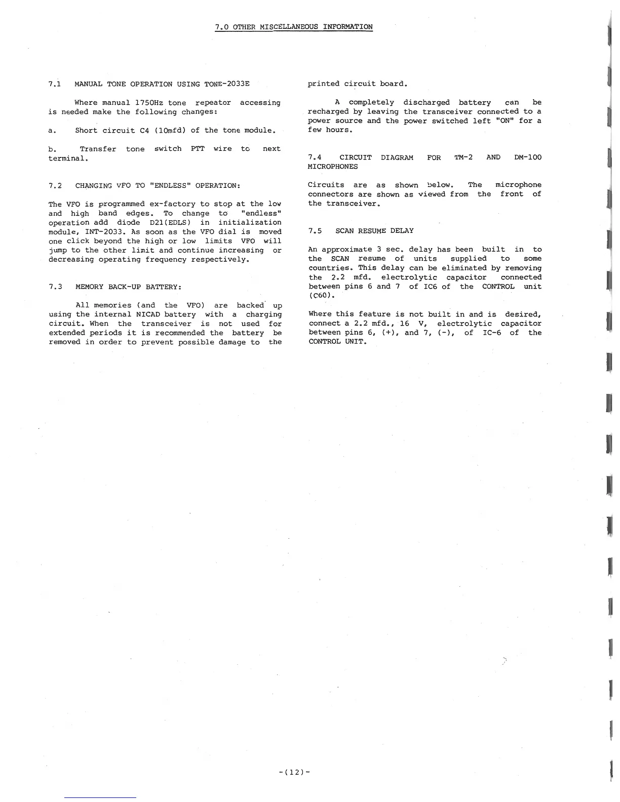 KDK FM-2033 - OTHER MISCELLANEOUS INFORMATION; TONE OPERATION AND VFO MODES; MEMORY BACKUP AND CIRCUIT DIAGRAMS; SCAN RESUME DELAY ADJUSTMENT