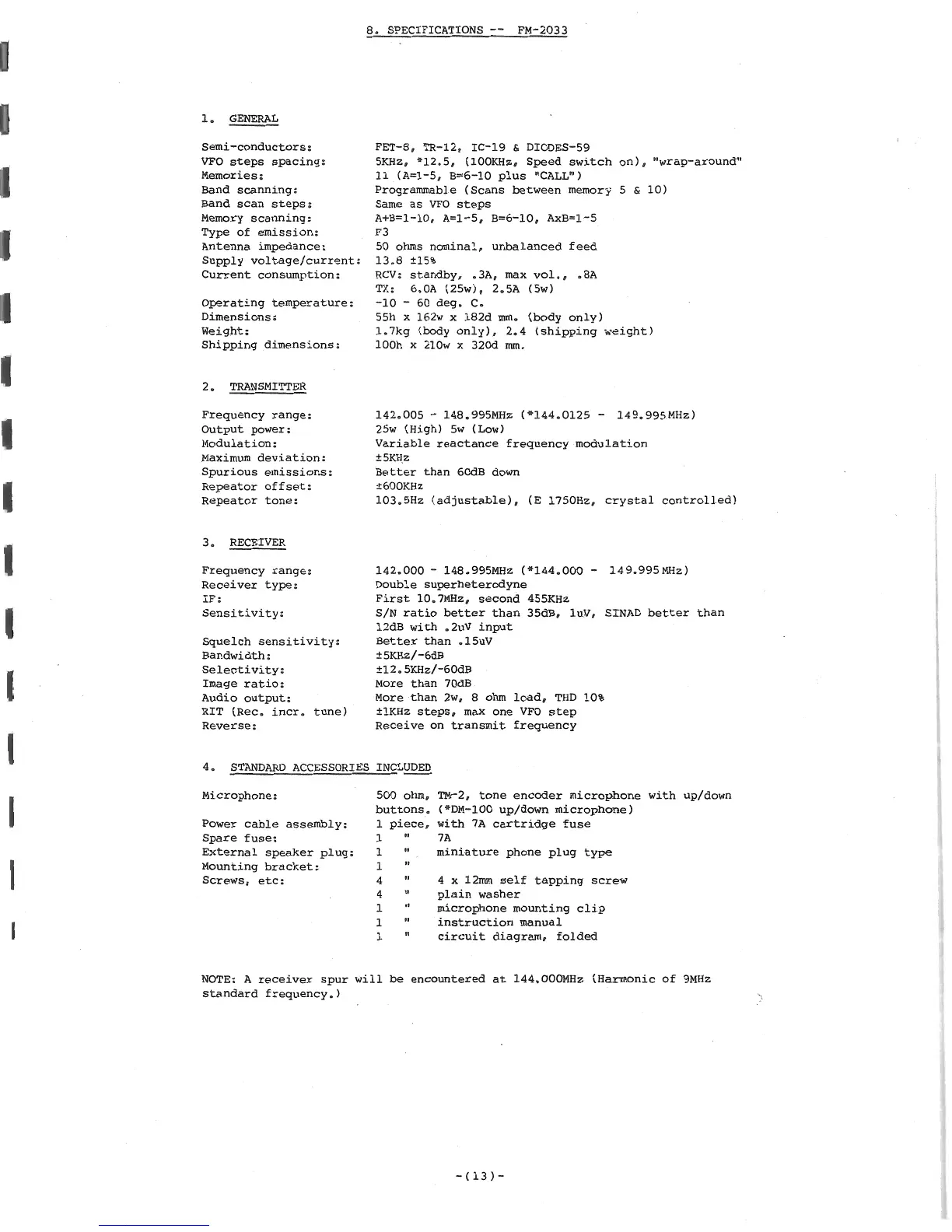 KDK FM-2033 - SPECIFICATIONS; GENERAL SPECIFICATIONS; TRANSMITTER SPECIFICATIONS; RECEIVER SPECIFICATIONS