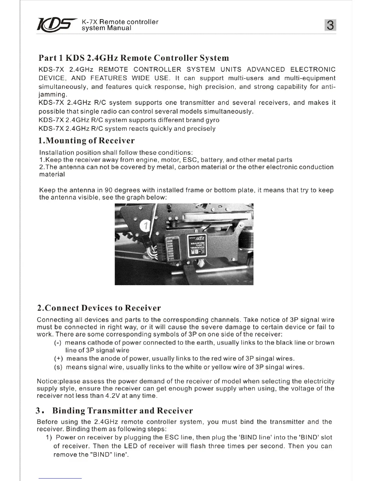 KDS K-7X - KDS 2.4 GHz Remote Controller System; Receiver Mounting and Connection; Transmitter and Receiver Binding
