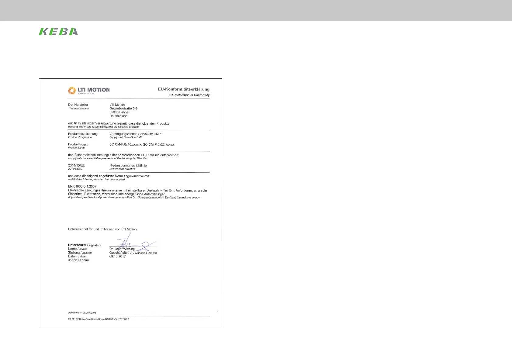 Keba ServoOne CM-P BG1 - Declaration of Conformity