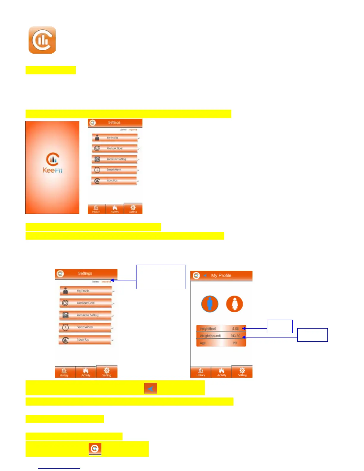 Remark: Select Metric or Imperial to change the “CM to Feet” and “Kg to ibs”.
