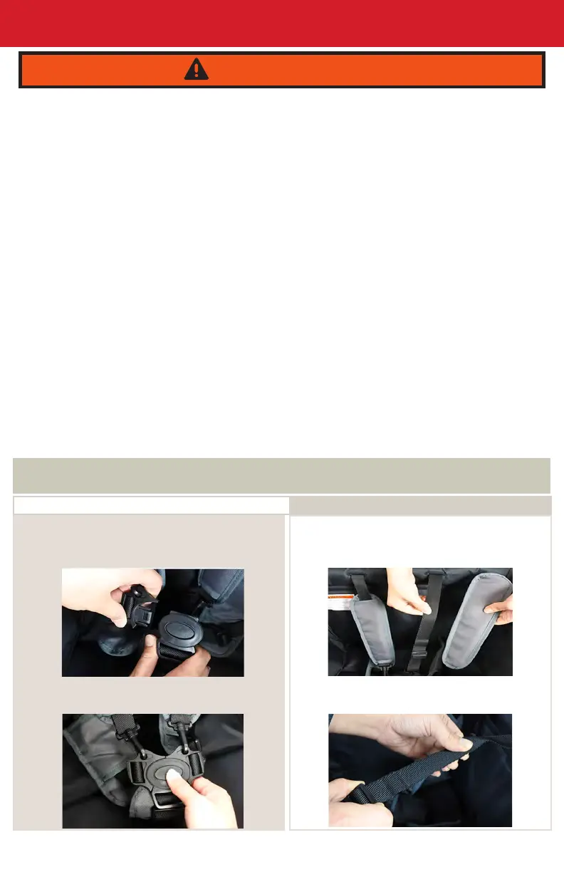 • Pour éviter toute blessure ou chute, toujours sécuriser les enfants avec le harnais à 5-points.