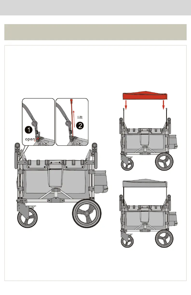 arrow, and lift the carriage pole upward (2). Finally, the four Angle buckles on the canopy are clamped