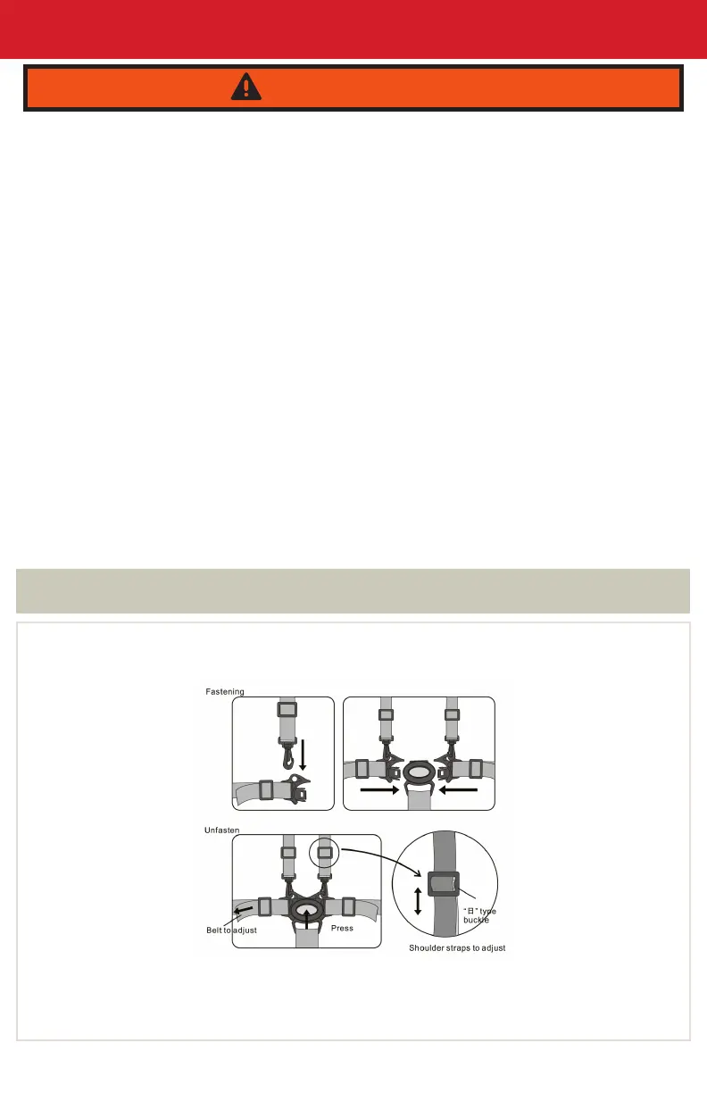 • Check that the 5-point safety harness and all attachment devices are correctly engaged before use.