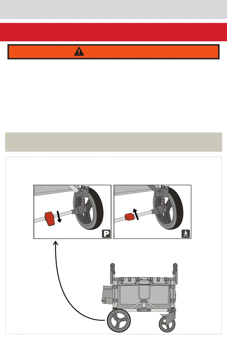 REAR-WHEEL BRAKE: press down the rear wheel brake pedal, the rear wheel brake, the stroller
