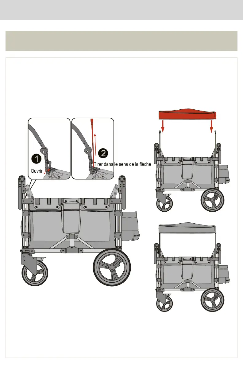 INSTALLATION DE L’AUVENT: En premier, mettre en place comme sur la photo (1), puis ouvrir et tirer