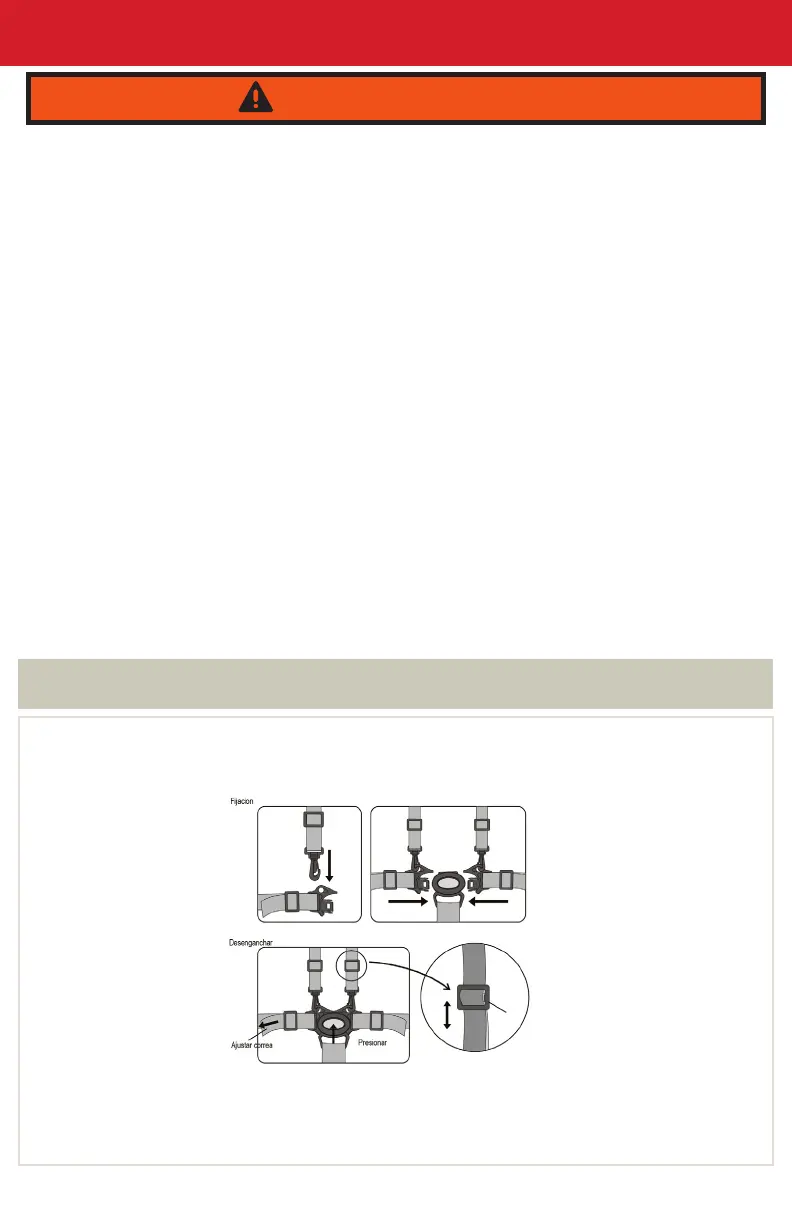 • Verifique que el arnés de seguridad de 5 puntos y todos los dispositivos de fijación estén