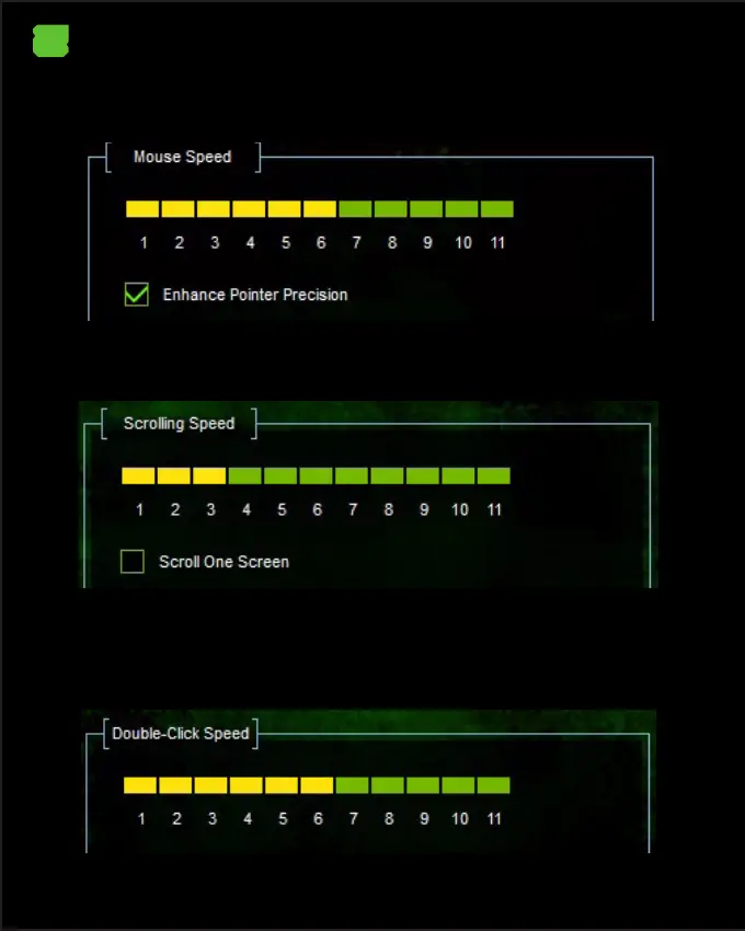 V posuvu můžete nastavit rychlost posunu myši kliknutím na stupnici od 1 do 11,