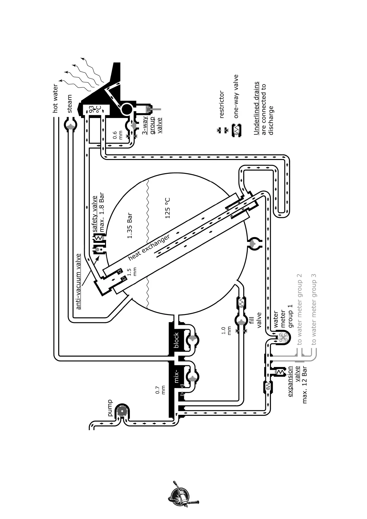 Figure W 3. Schematic hydraulics Mirage when brewing. Sizes of restrictors may be different in your