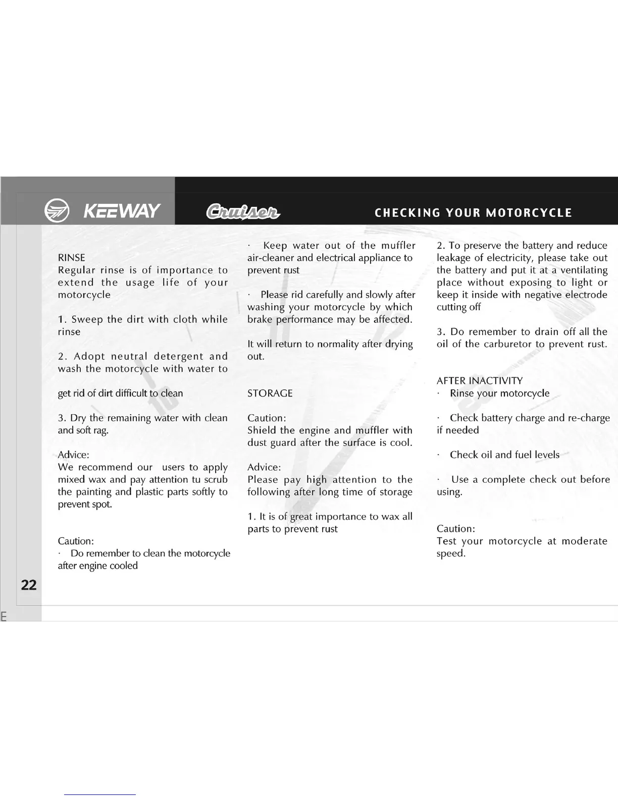 KEEWAY Cruiser 250 - Checking Your Motorcycle: Rinse; Checking Your Motorcycle: Storage; Checking Your Motorcycle: after Inactivity