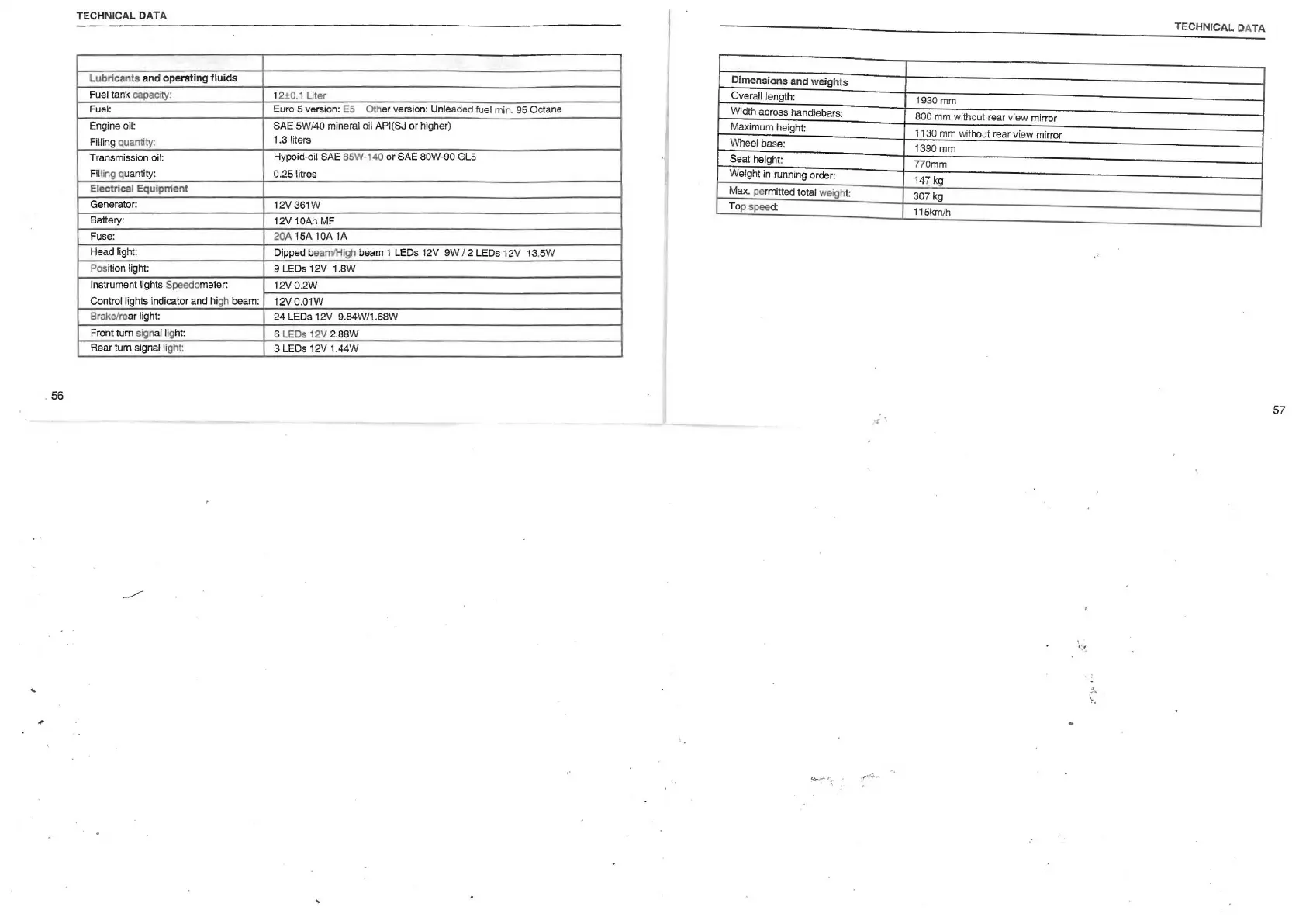 KEEWAY Vieste 250 - Lubricants, Fluids, Dimensions, and Weights