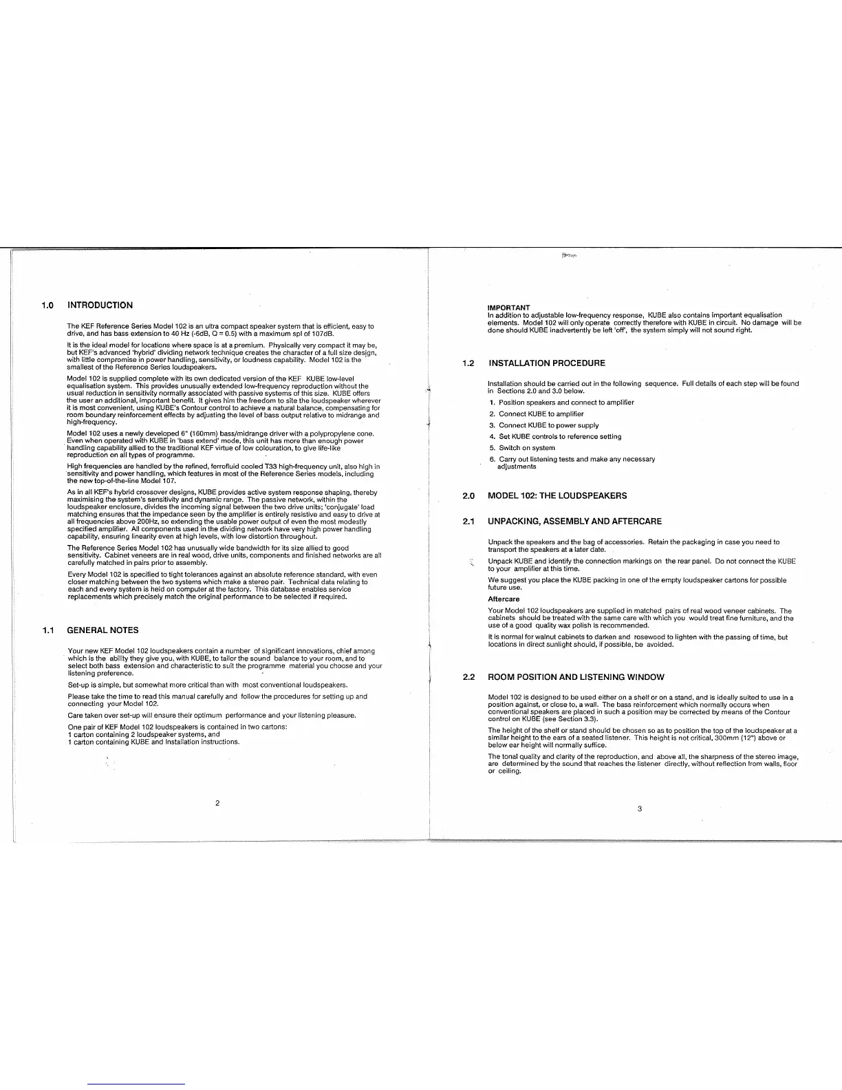 KEF 102 - 1.0 INTRODUCTION; 1.1 GENERAL NOTES; 1.2 INSTALLATION PROCEDURE; 2.0 MODEL 102 LOUDSPEAKERS
