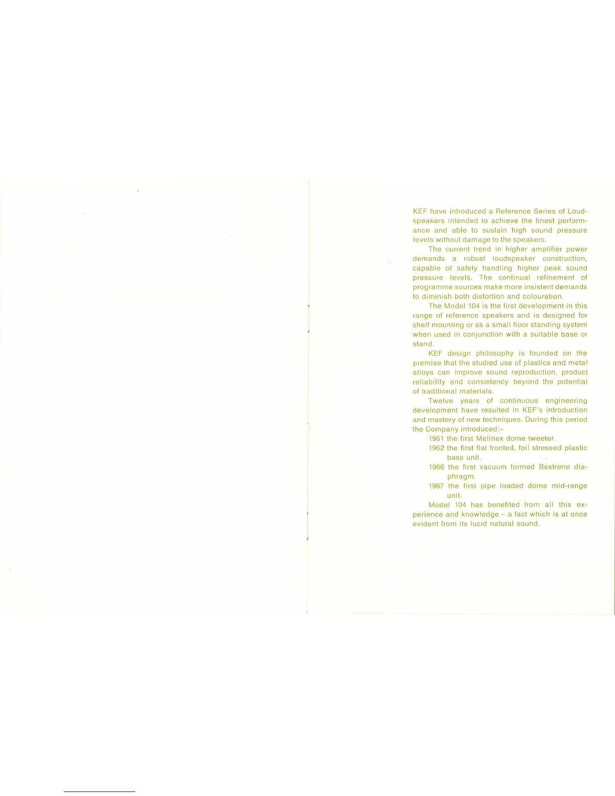 KEF 104 - Introduction and Design Philosophy; Reference Series Introduction; KEF Engineering Milestones