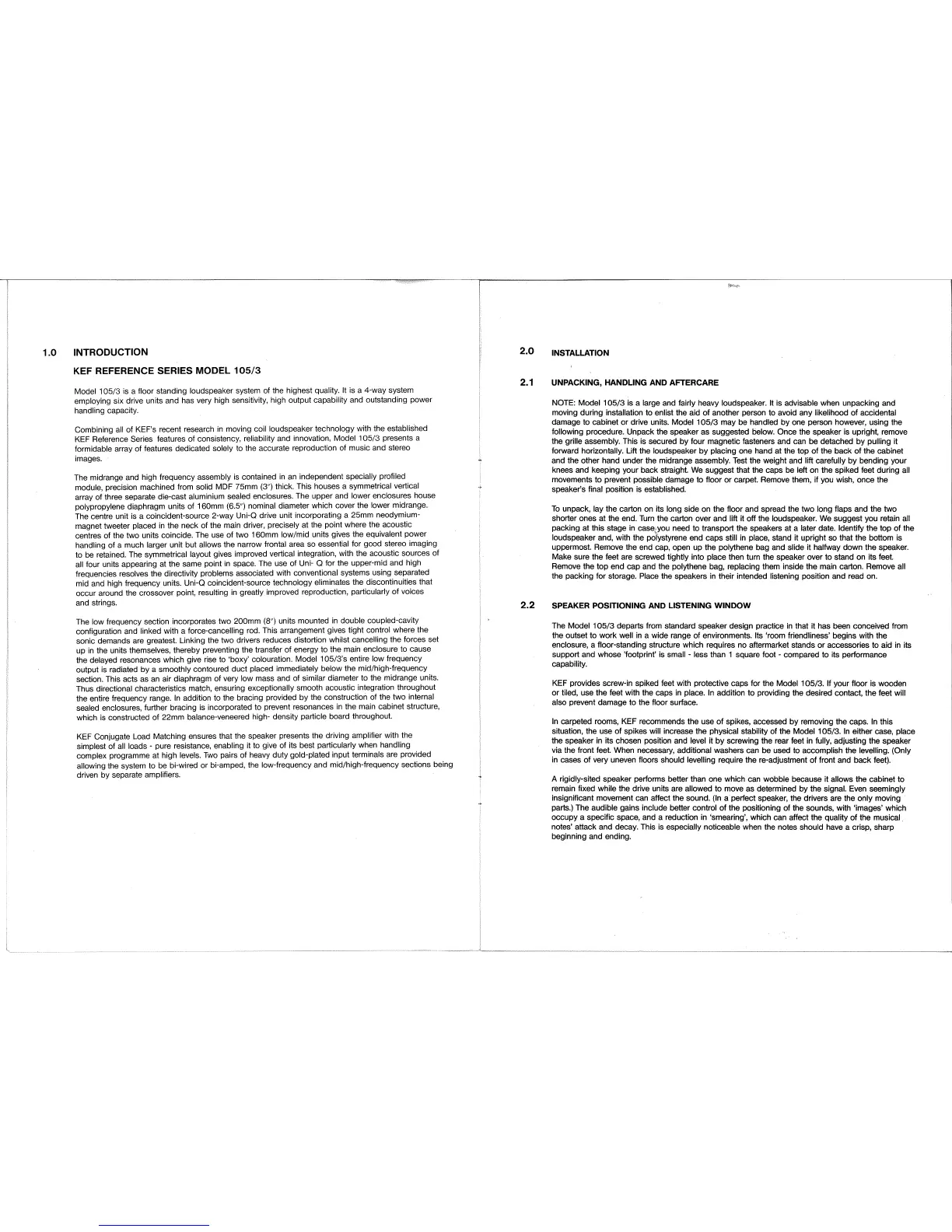 KEF 105/3 - Introduction; Installation; Unpacking, Handling, and Aftercare; Speaker Positioning and Listening Window