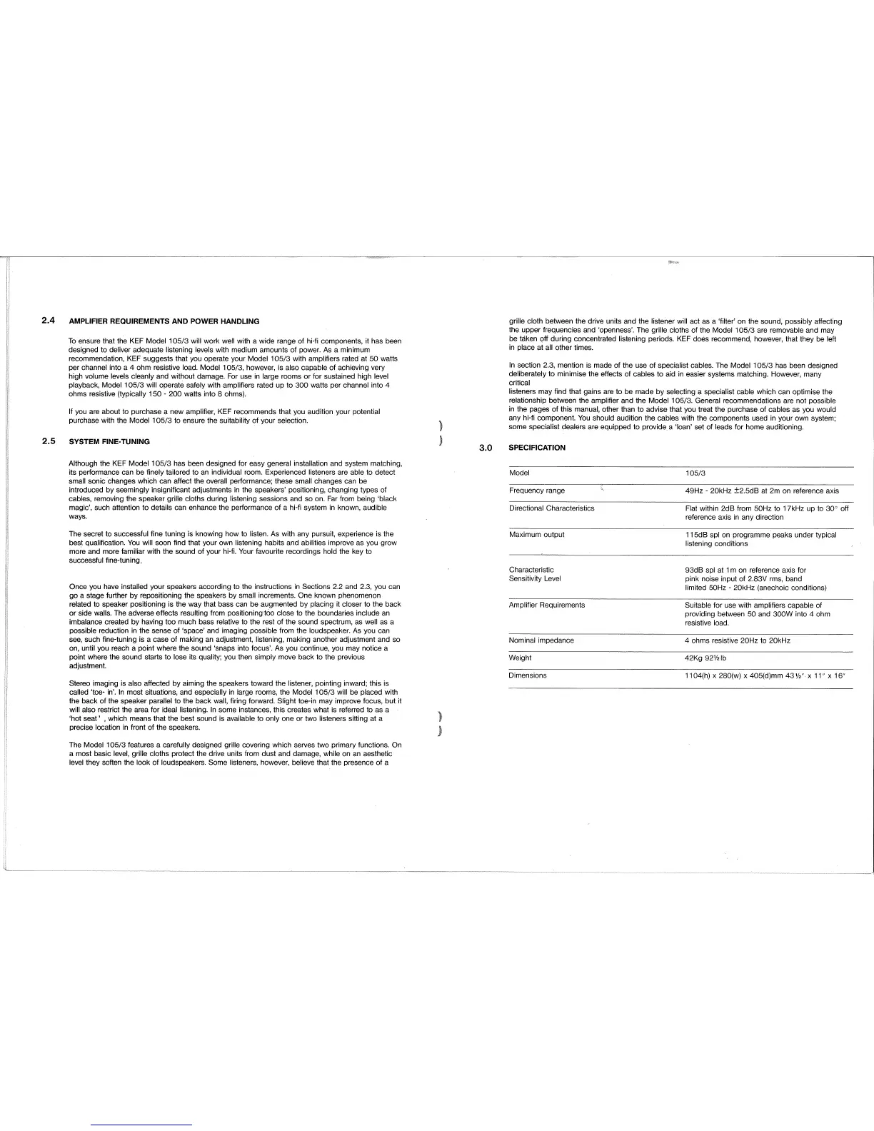 KEF 105/3 - Amplifier Requirements and Power Handling; System Fine-Tuning; Specification