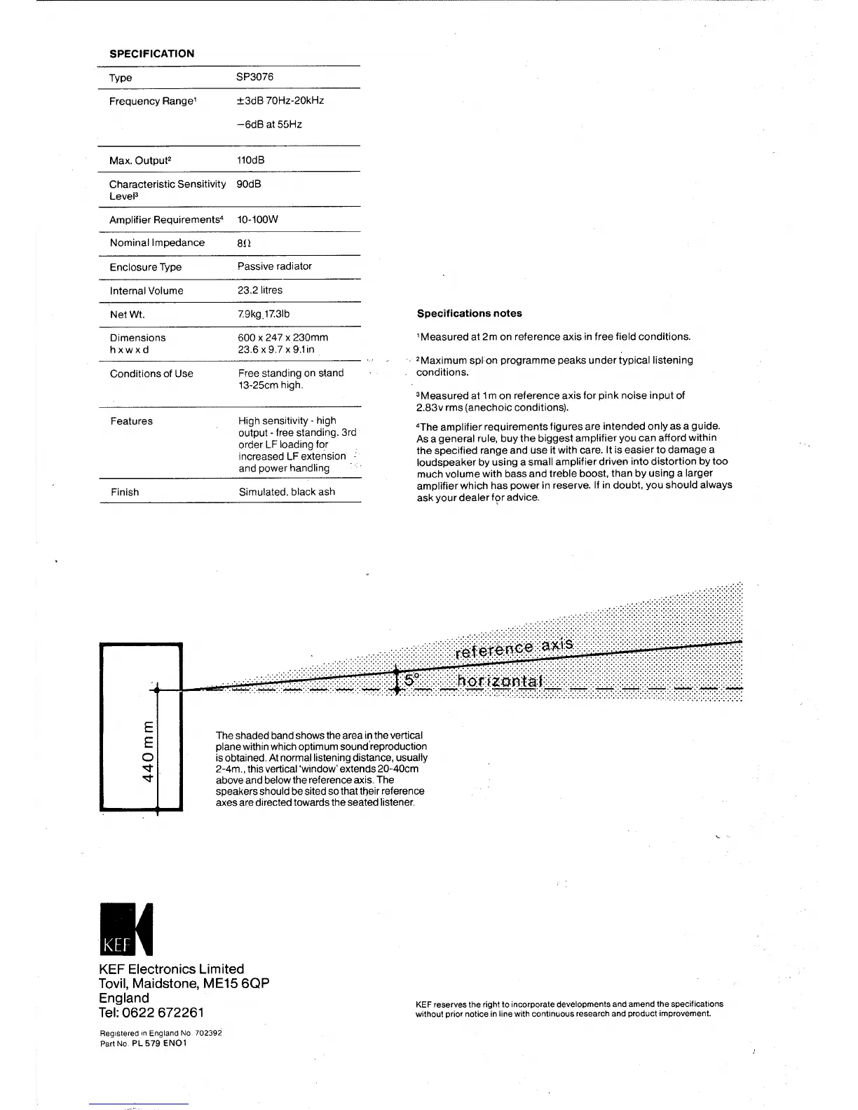 KEF CARA SP3076 - Specifications; Specifications Notes; Optimal Listening Area