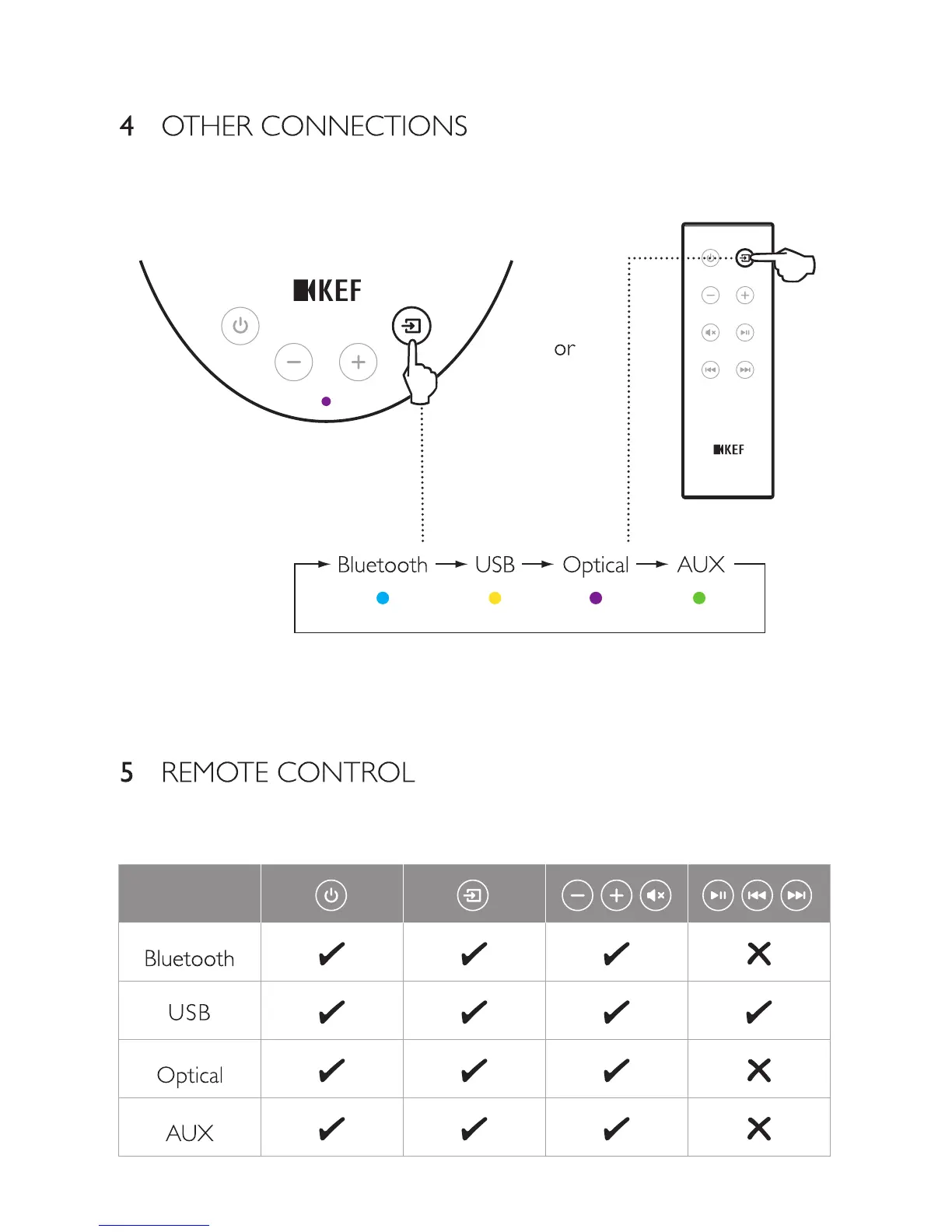 KEF EGG - Additional Connections and Remote Functions; Other Input Options; Remote Control Operation Summary
