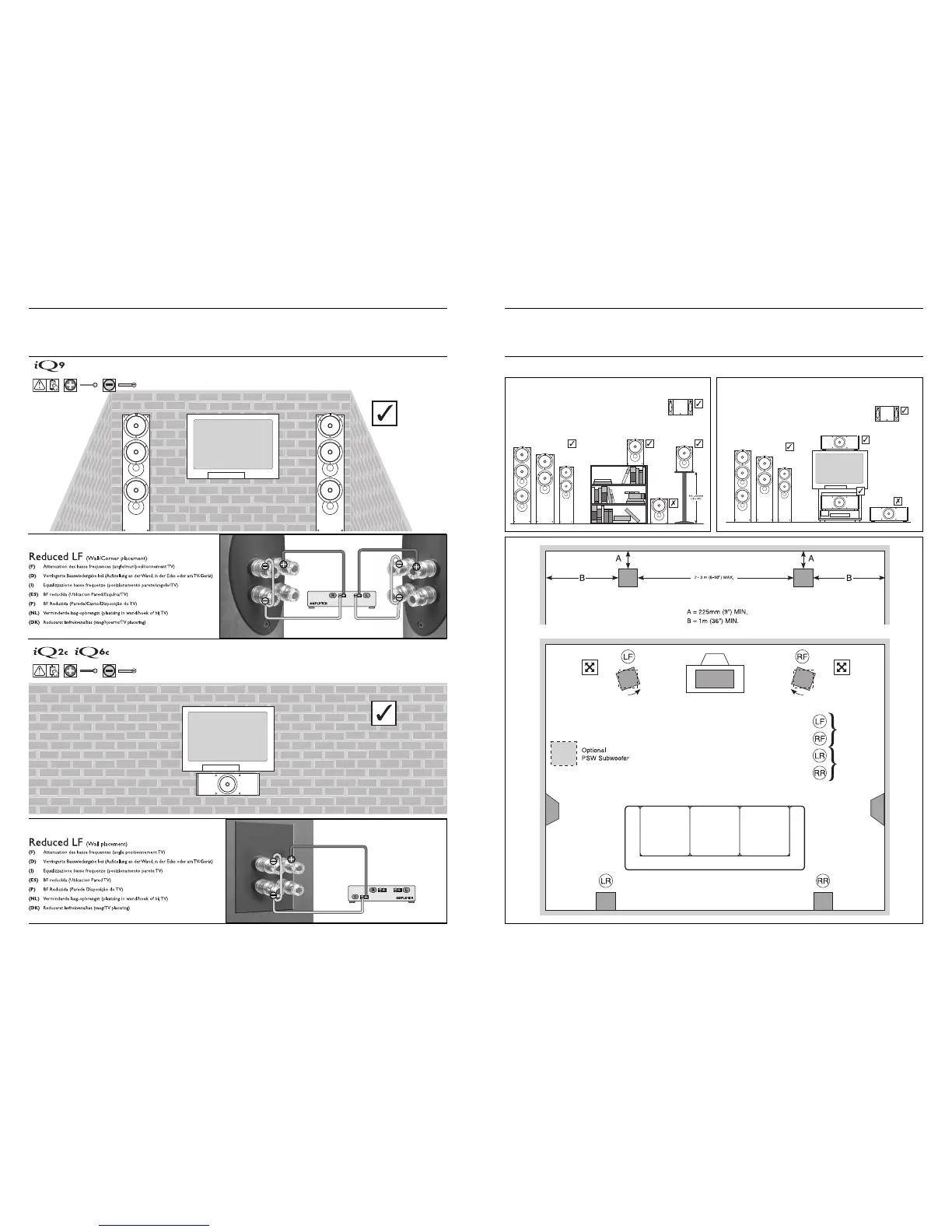 KEF iQ9 - Speaker Connections and Positioning; Reduced LF Placement Guidance; Speaker Positioning Diagrams