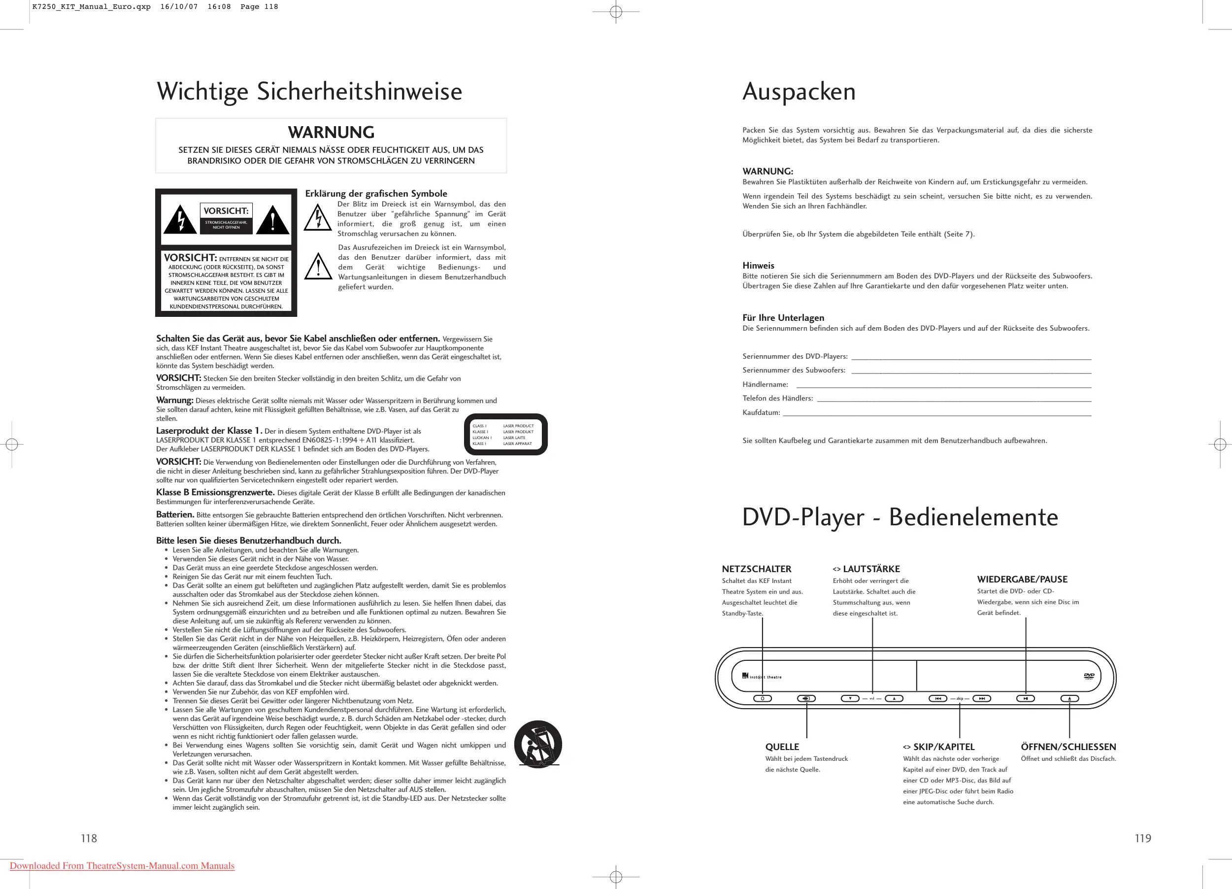 Laserprodukt der Klasse 1. Der in diesem System enthaltene DVD-Player ist als