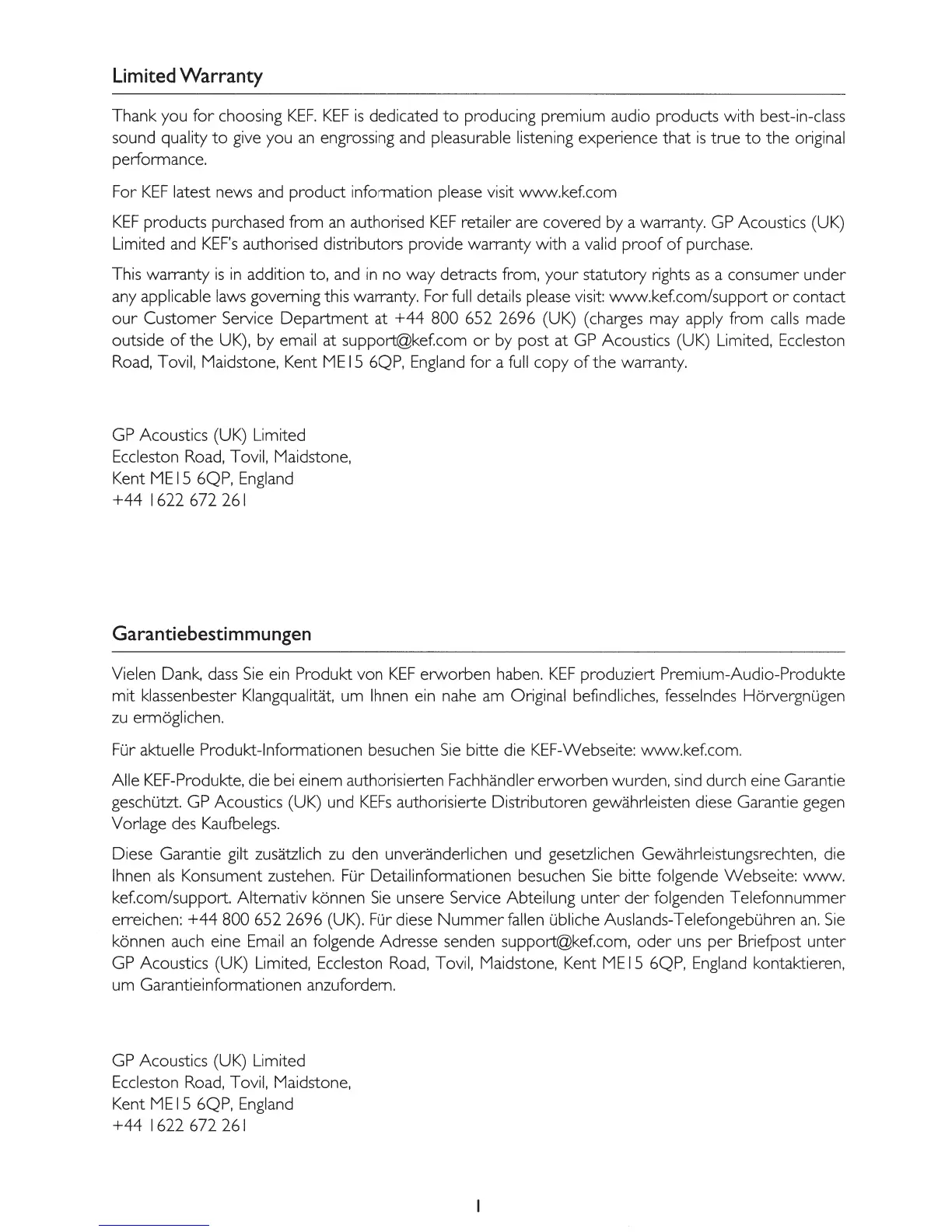 Aile KEF-Produkte, die bei einem authorisierten Fachhandler erworben wurden, sind durch eine Garantie