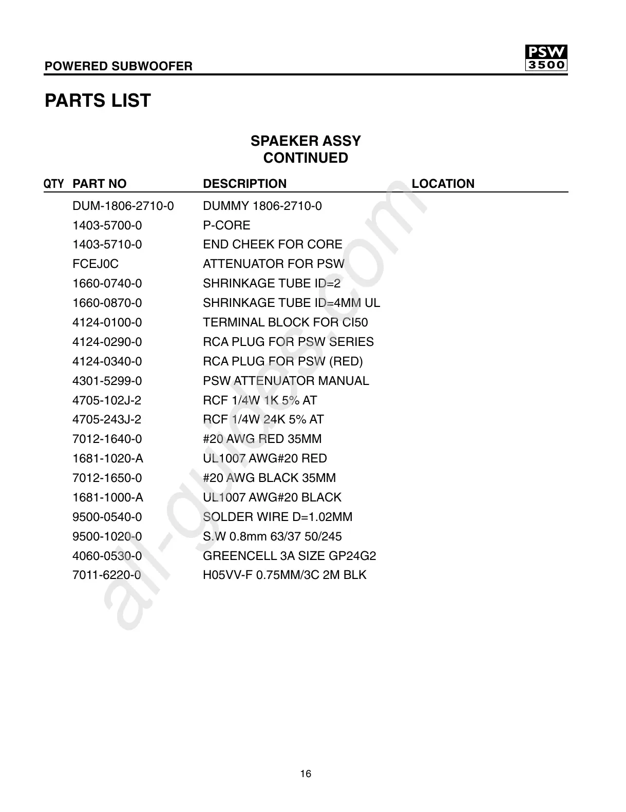 PART NO DESCRIPTION LOCATION