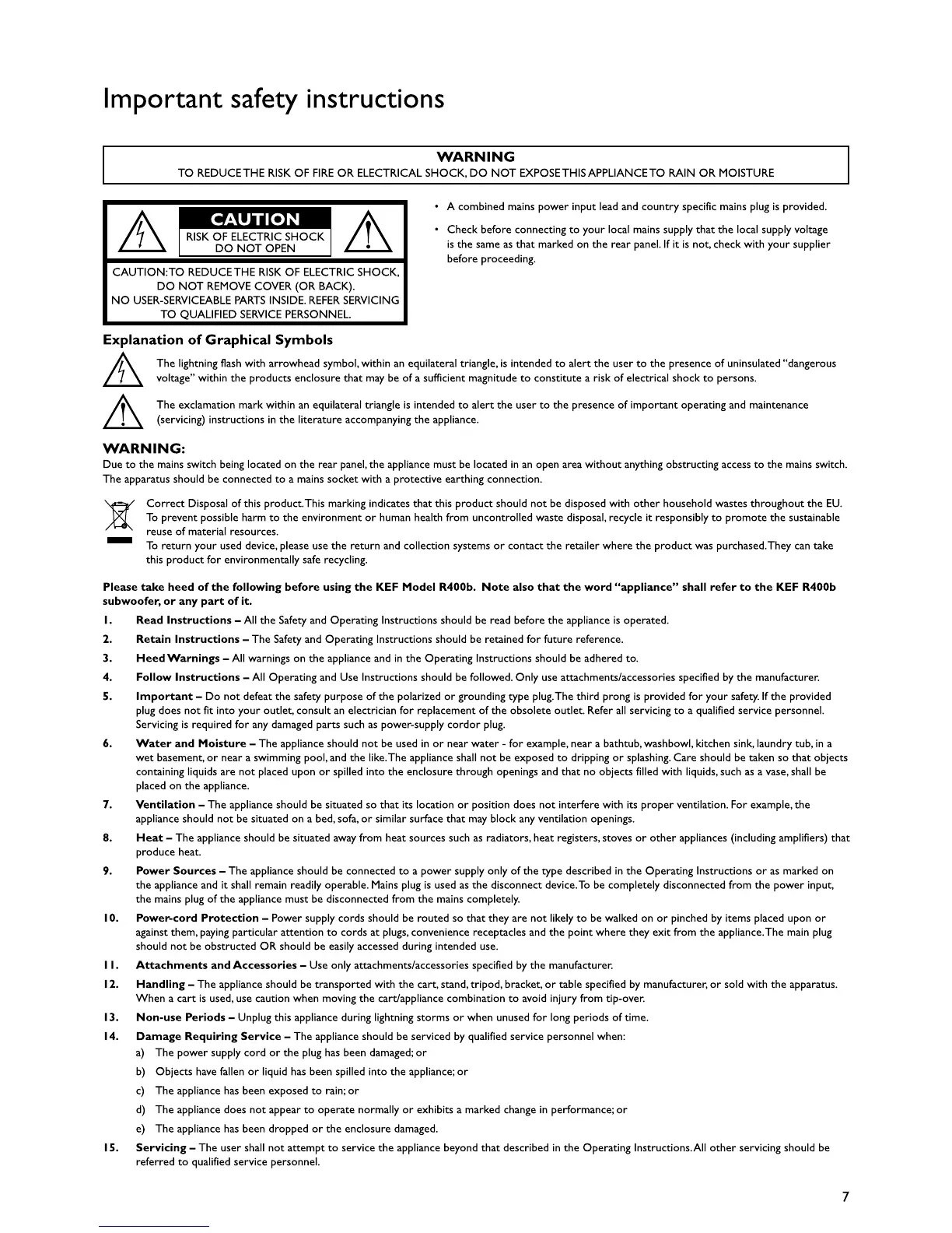 KEF R400b - Important Safety Instructions; Graphical Symbols and General Guidance; Electrical, Placement, and Environmental Safety; Handling, Protection, and Service