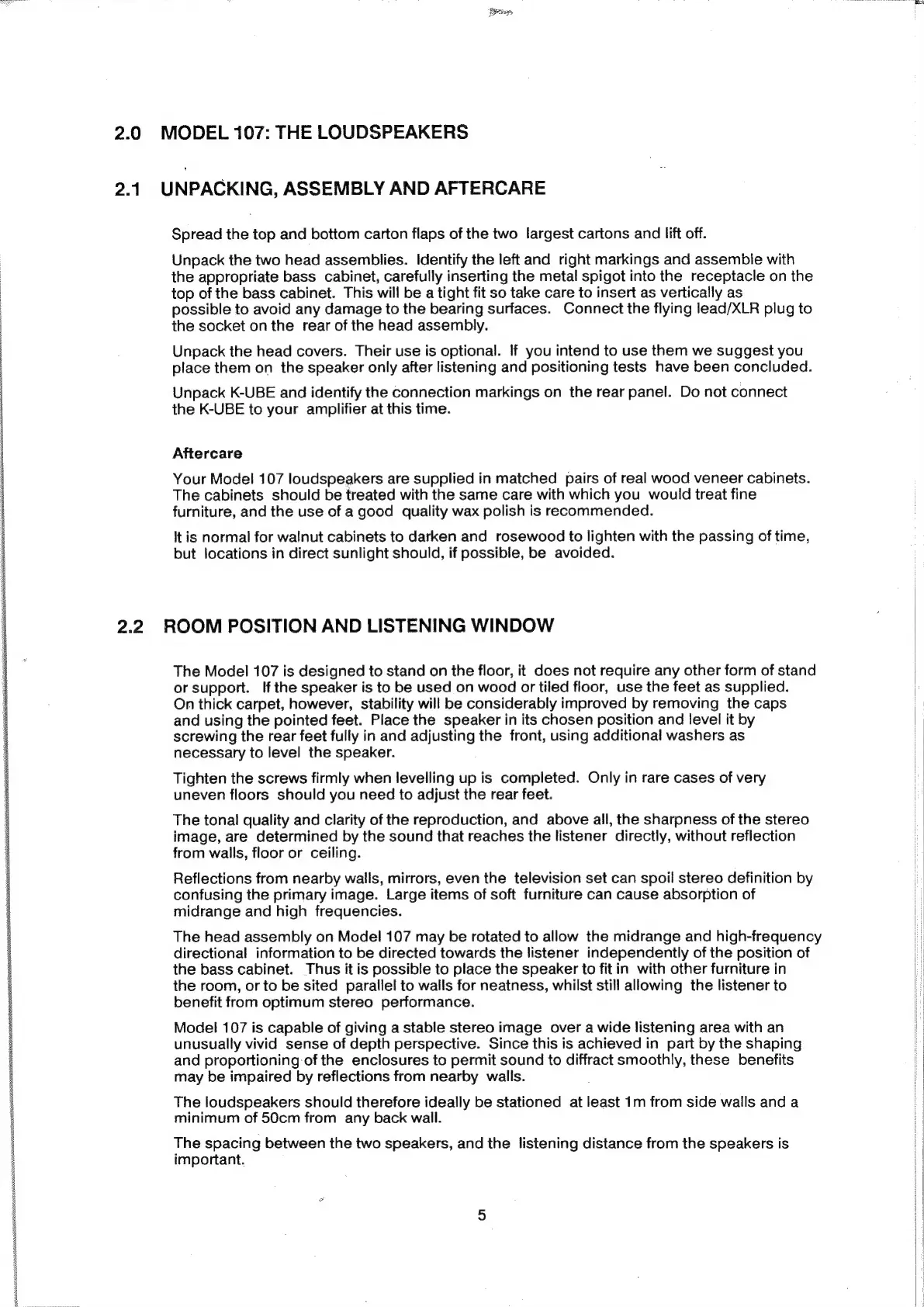 KEF REFERENCE 107 - Model 107: the Loudspeakers; Unpacking, Assembly and Aftercare; Room Position and Listening Window