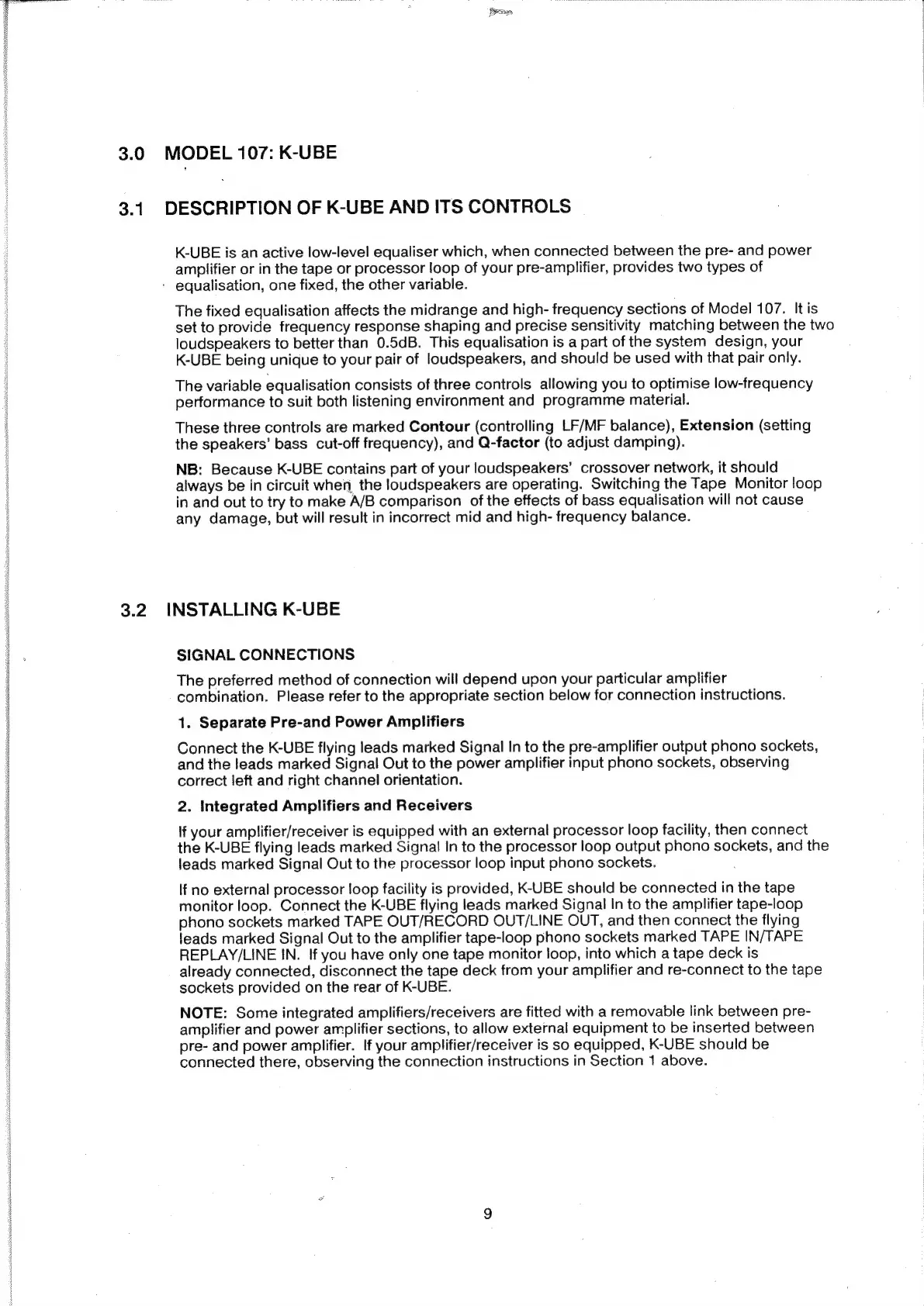 KEF REFERENCE 107 - Model 107: K-UBE; Description of K-UBE and Its Controls; Installing K-UBE; Signal Connections