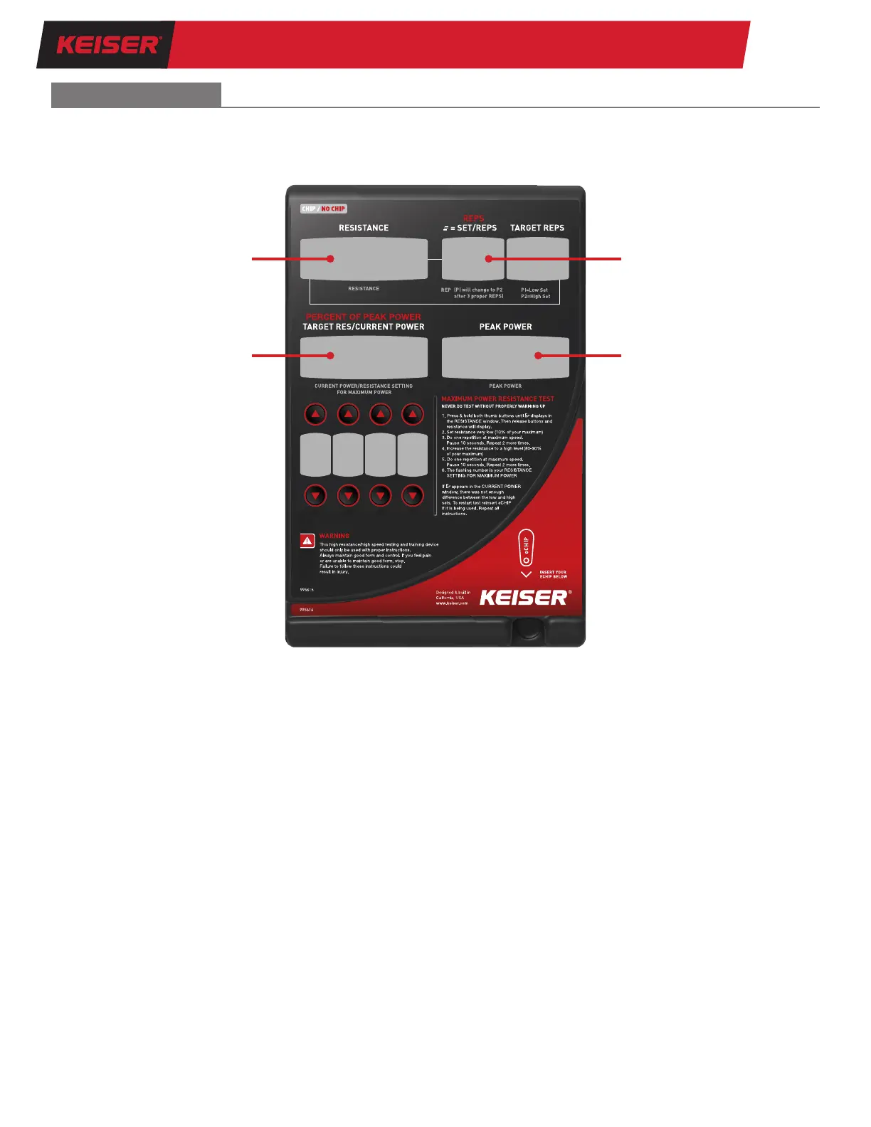 Resistance, Reps, and Power workout data output on the Power Display are shown below.