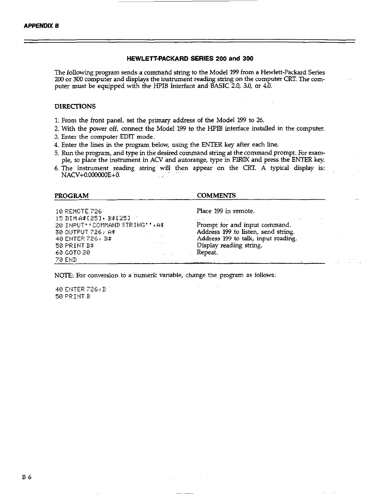 The following program sends a corm-iiaiid string to the Model 199 from a Hewlett-Packard Series