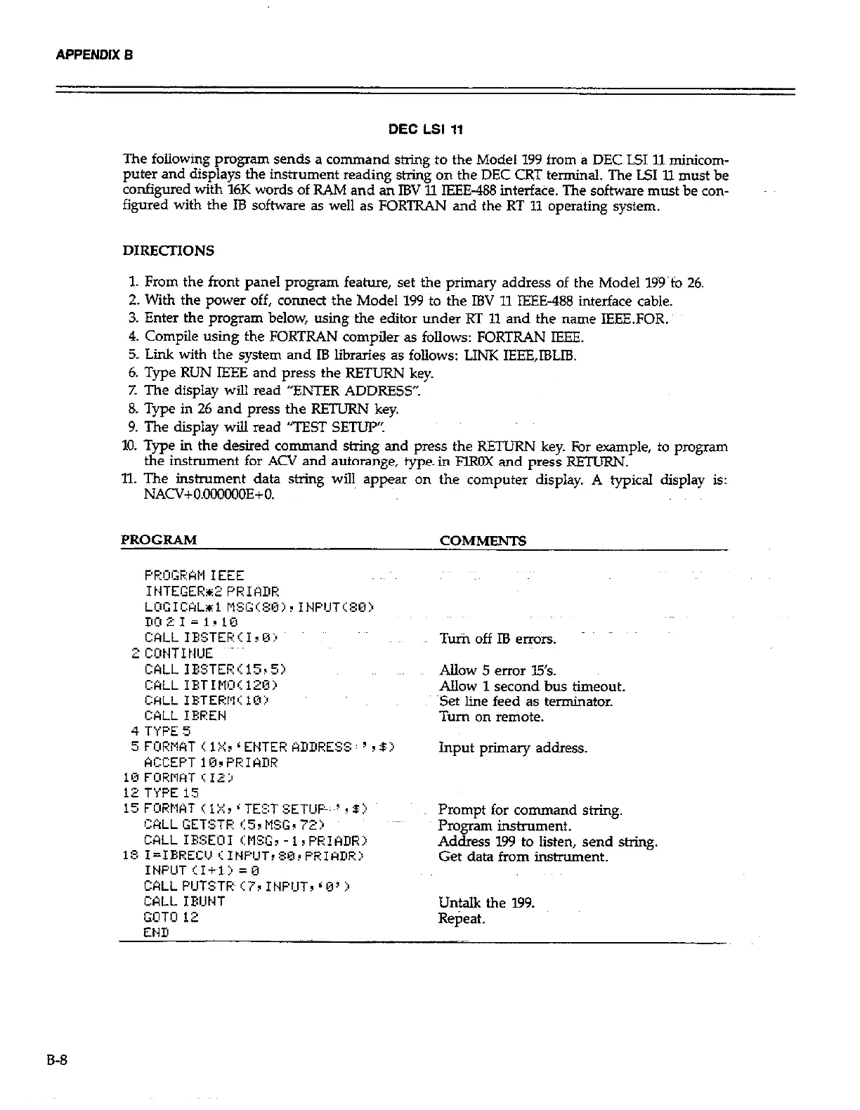 The following program sends a command string to the Model 199 from a DEC LSI 11 minicom-
