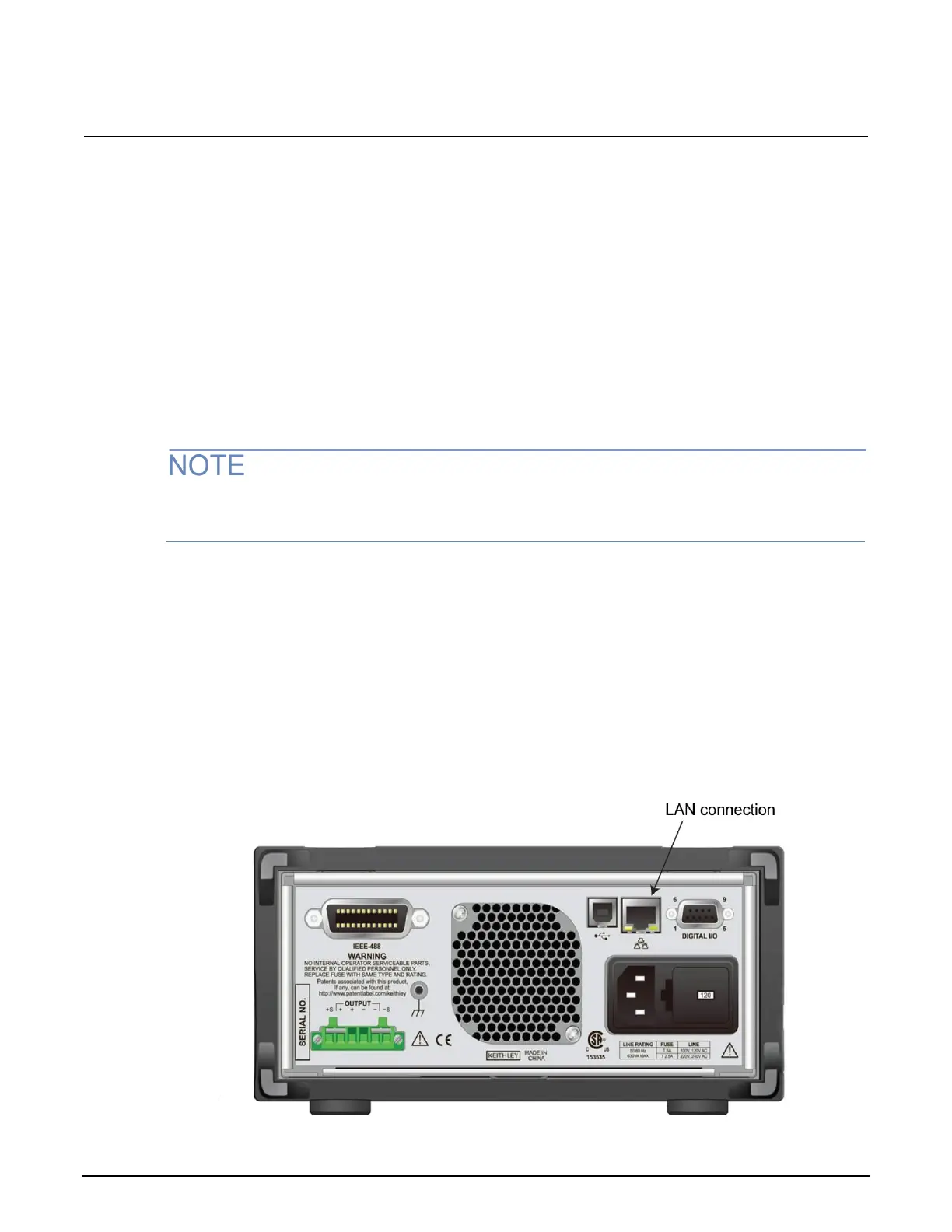 The following figure shows the location of the LAN connection on the rear panel of the instrument.
