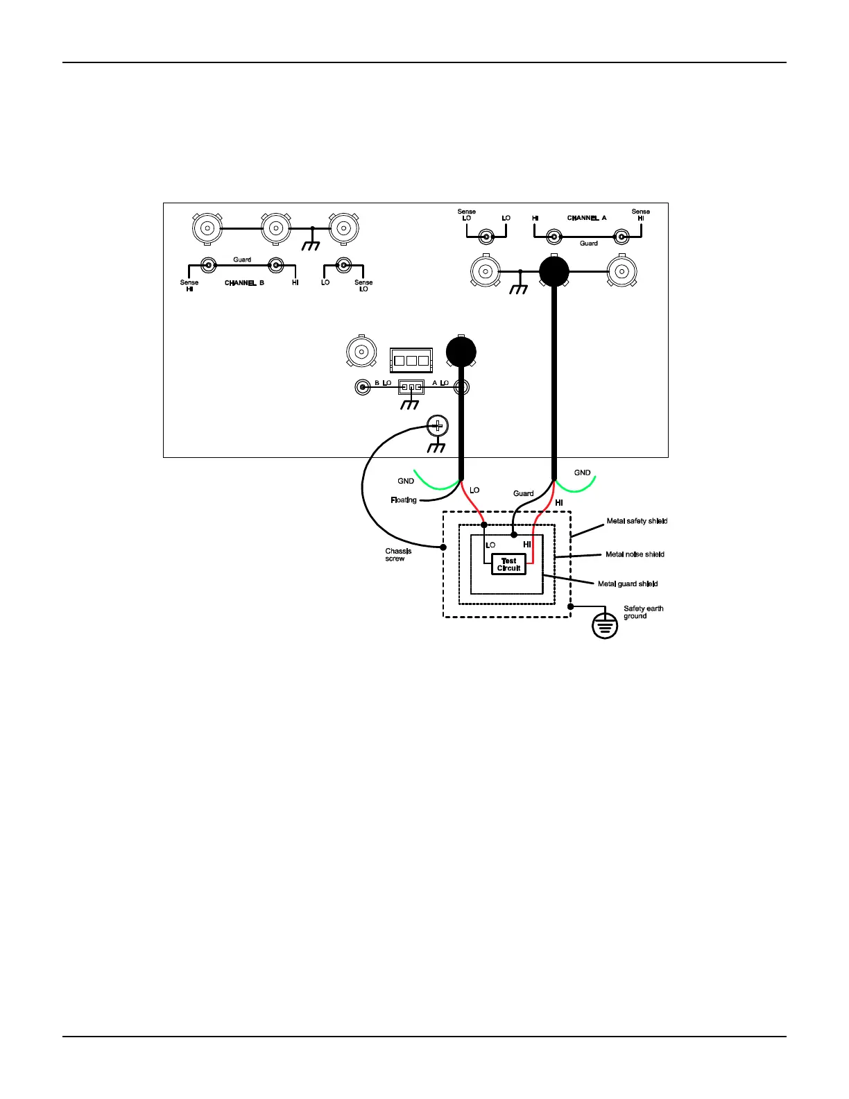 The inner shield (guard) of the HI triax cable is connected to the test fixture guard shield, and the