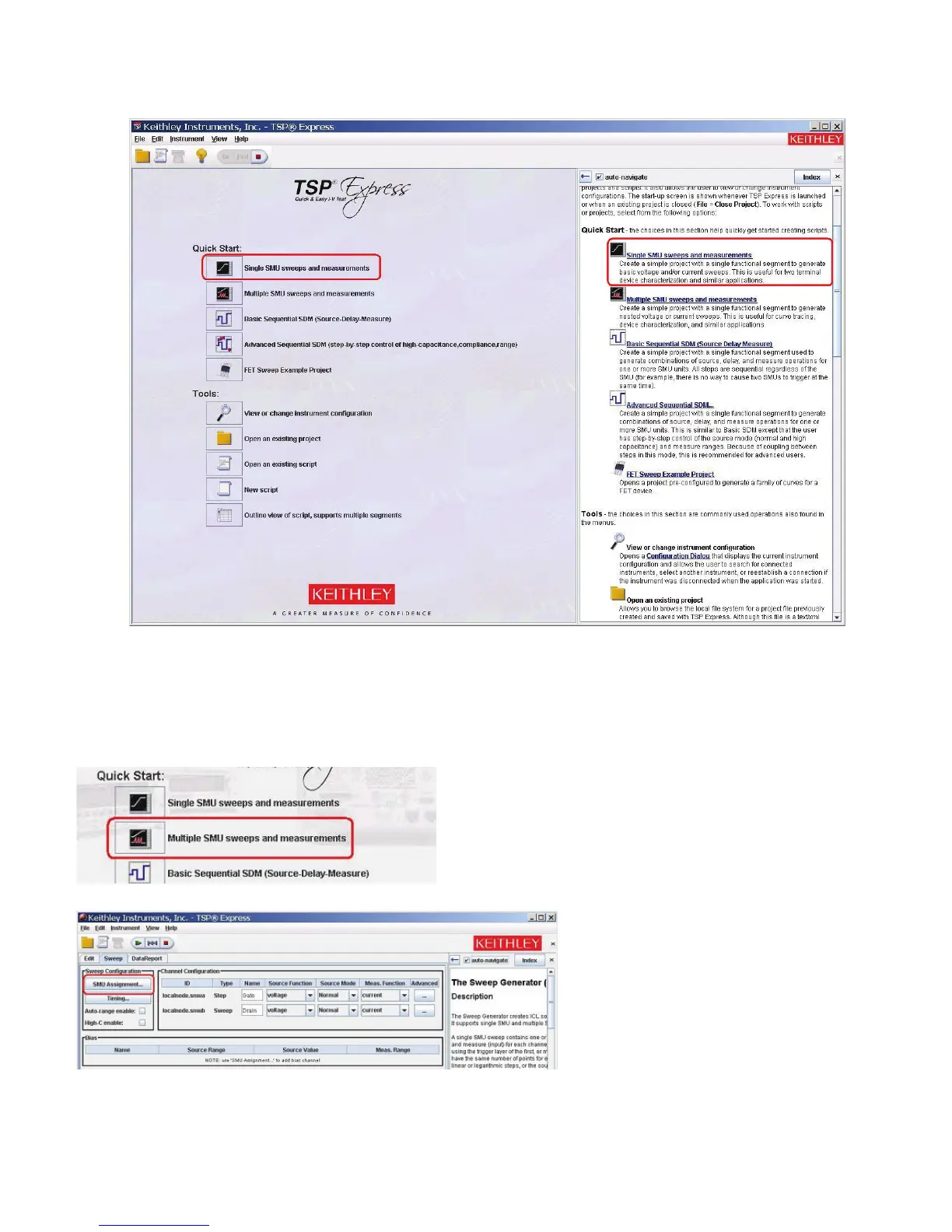 Quick start menu of TSP Express includes pre-configured tests for common SMU functionality, such as sweeps, pulse and sequential source-measure