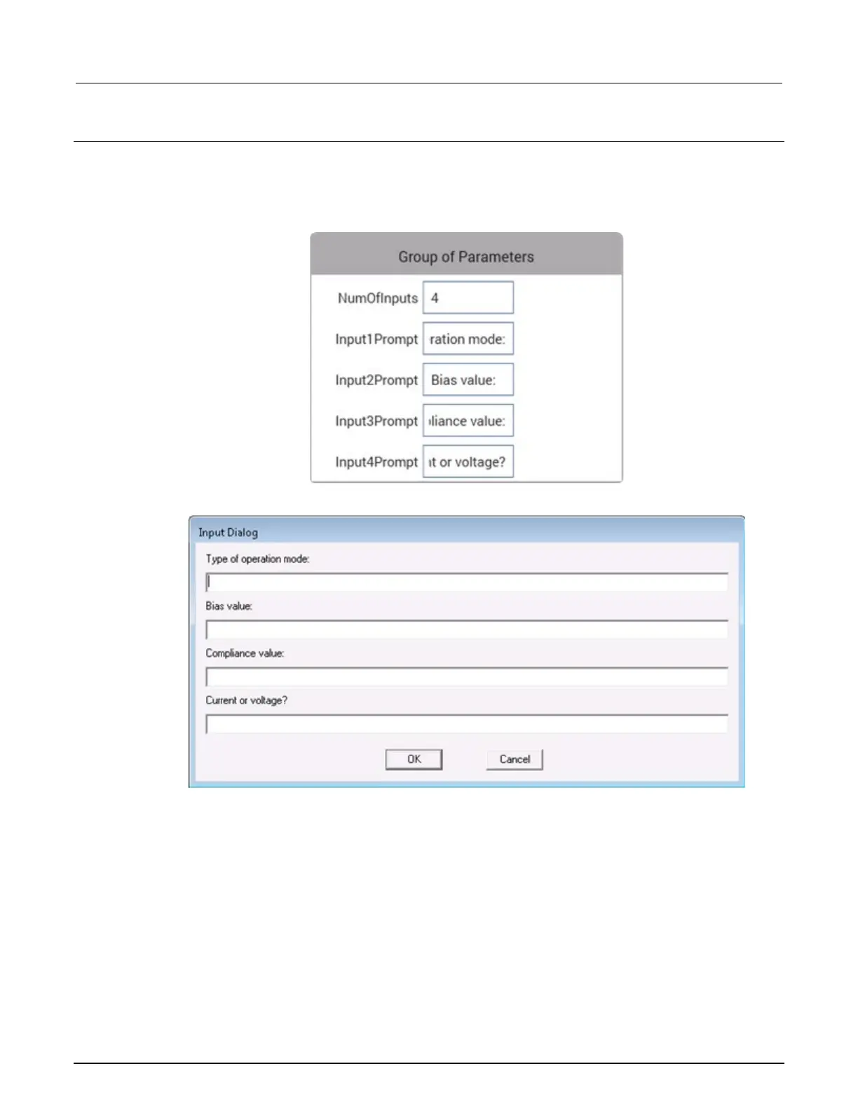 There is a separate user-entered prompt message for each input. An example of the entry in Clarius