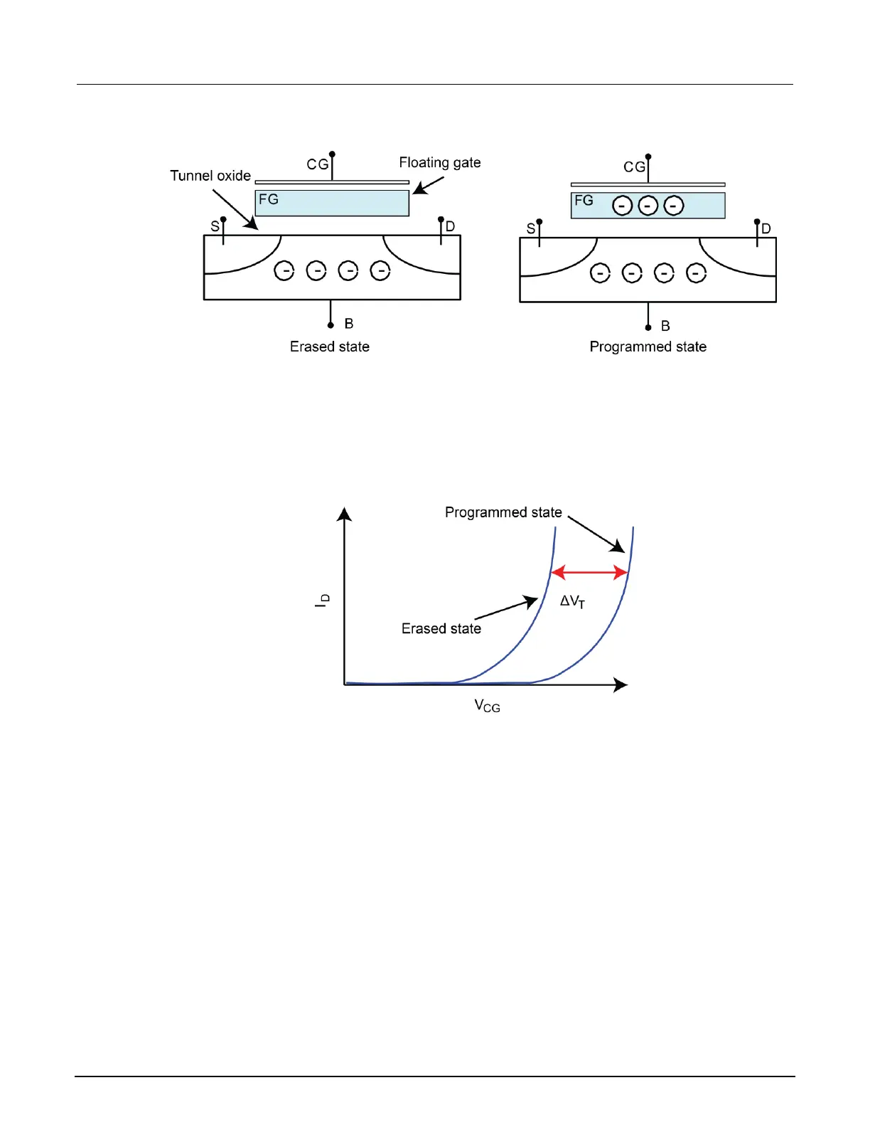 Figure 155: Cross section of a floating gate transistor in the erased and programmed states